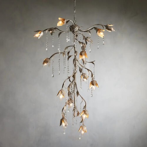 Hand-cast by artisans from solid iron, the Viticcio chandelier resembles garden vines fresh from the rain. The hand-painted silver finish highlights the exuberance of the flowers, and hand-strung crystals dangle to scatter drops of light across your space.