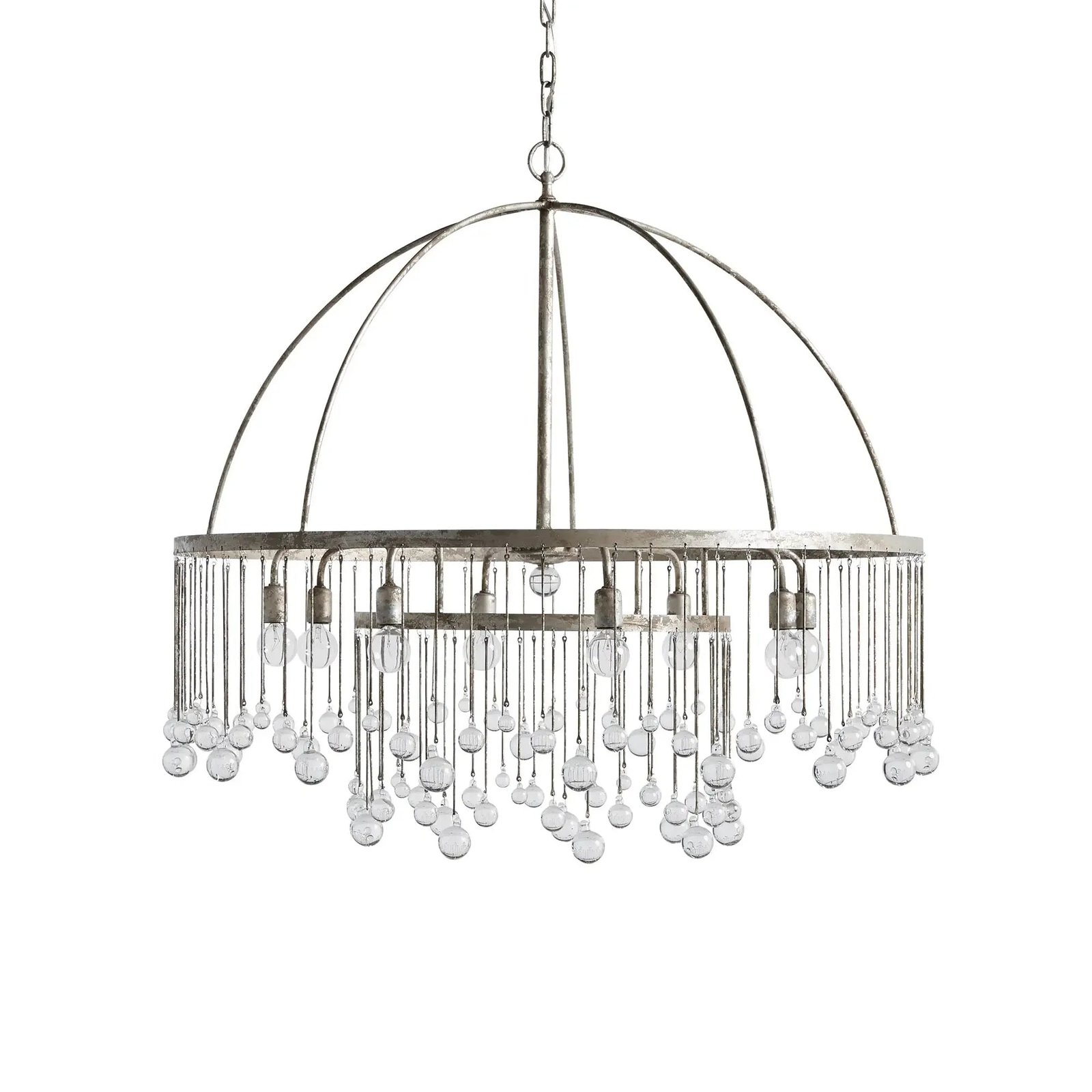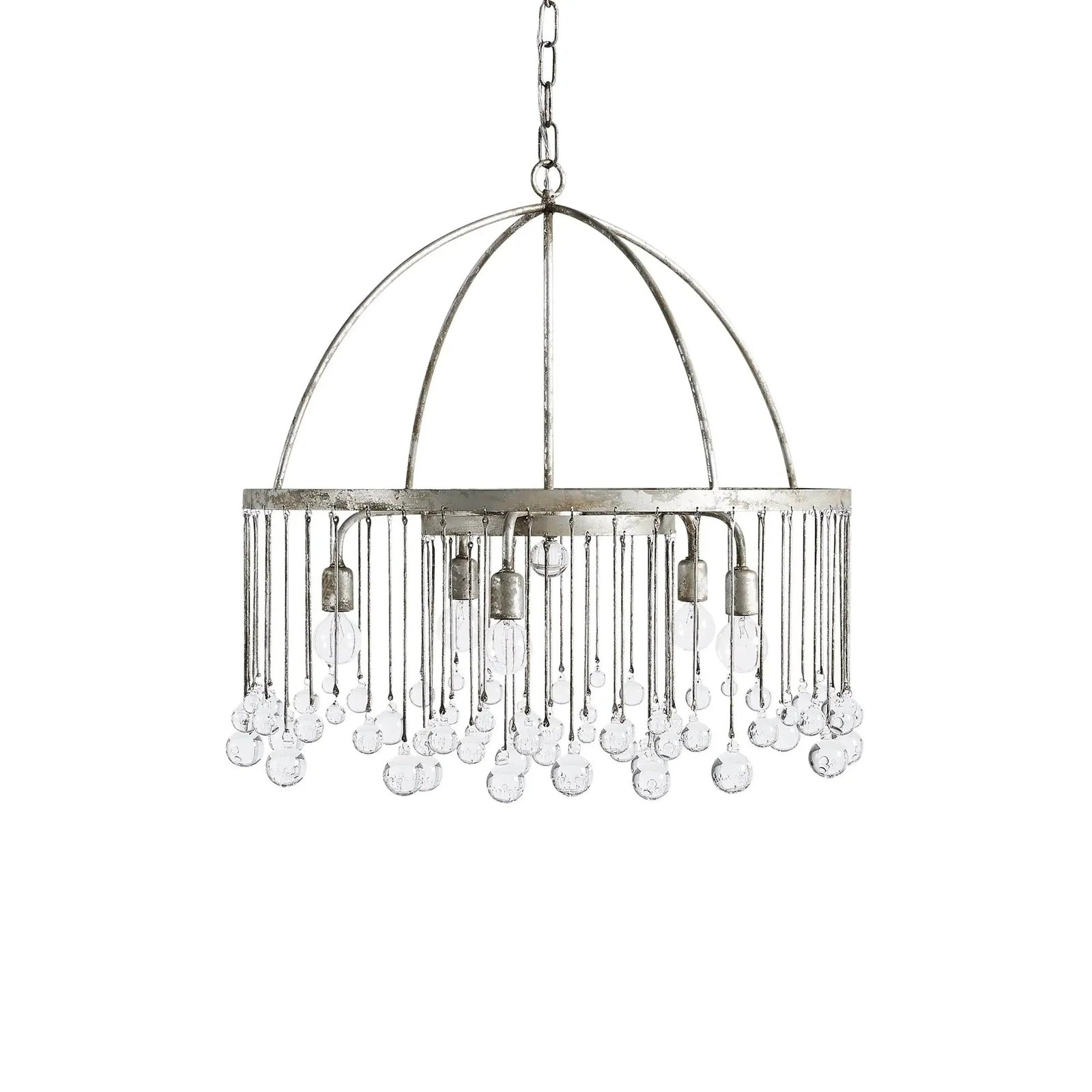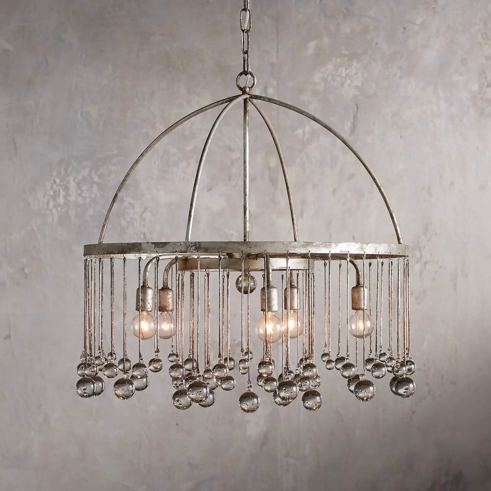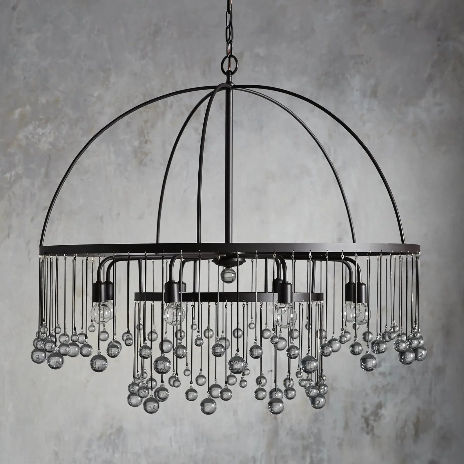 Whether in an old French chateau or a downtown New Orleans loft, our Modern Aubrey Lighting creates a striking atmosphere in any setting. Crystal drops of varying lengths hang from an iron cage, creating the illusion of movement in the light and refracting brilliant beams of light around the room.