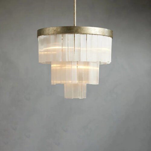 Our Cameron Lighting Collection is adorned with natural selenite crystals and hangs under an iron frame to reflect the elegant light. Our hand brushed antique silver finish creates a glamorous aesthetic.