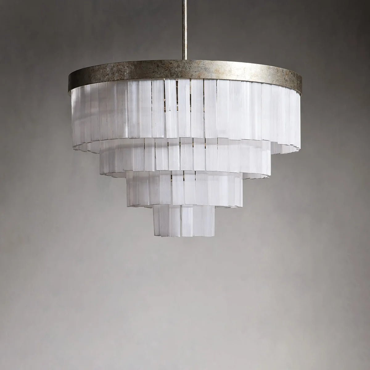Our Cameron Lighting Collection is adorned with natural selenite crystals and hangs under an iron frame to reflect the elegant light. Our hand brushed antique silver finish creates a glamorous aesthetic.