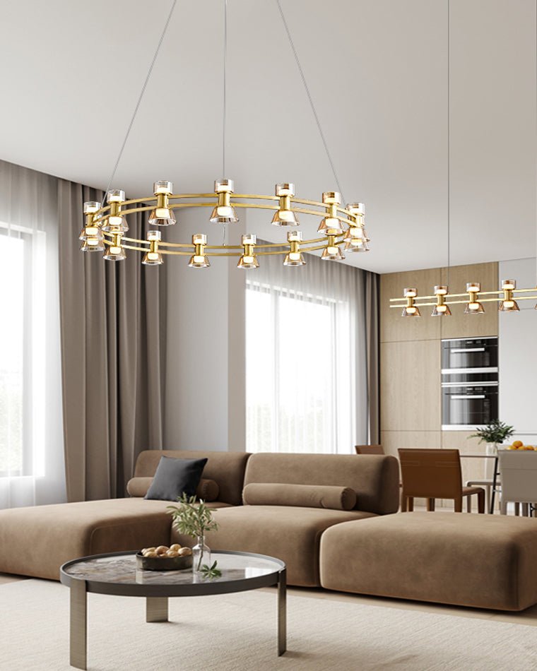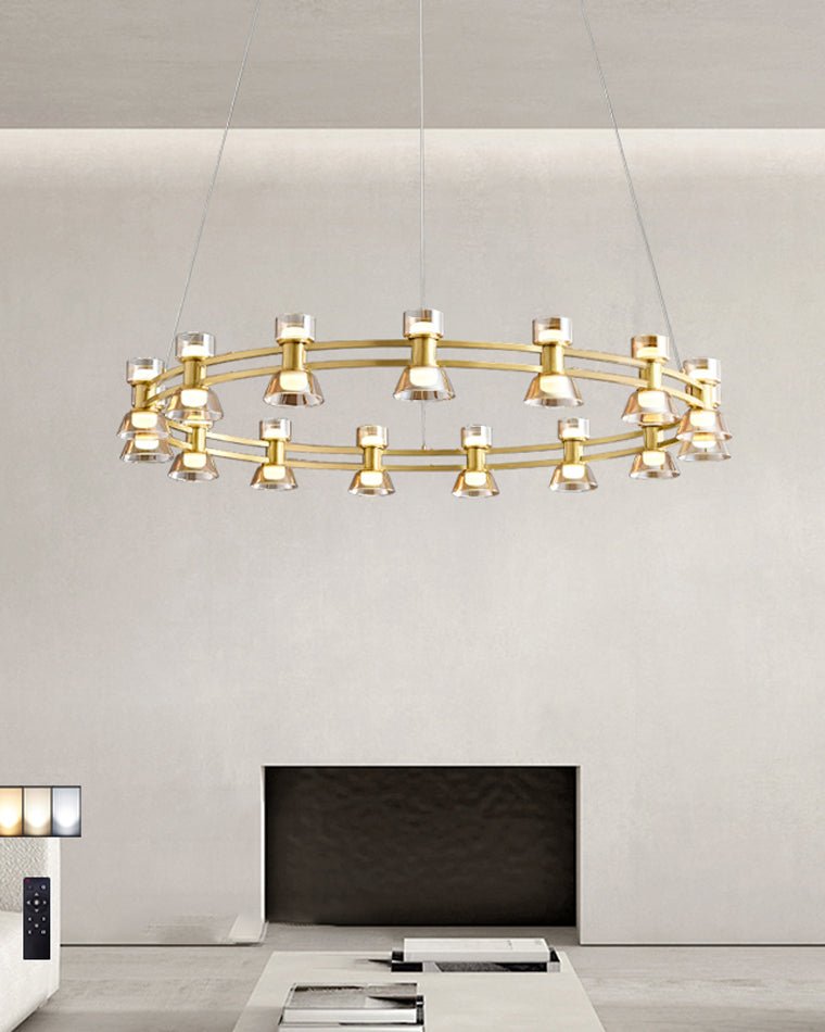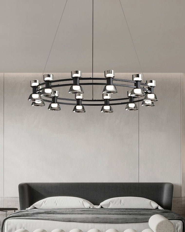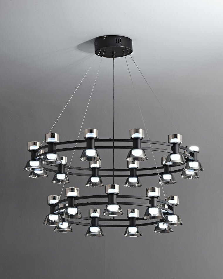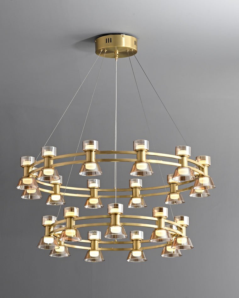 Upgrade your living space with the jucci 2 tier Black/Gold Brass Chandelier-WM2224. Perfect for the living room, dining room, or bedroom, this chandelier features amber or smoked glass lampshades that add visual comfort and an elegant touch. Its timeless and modern design is both affordable and luxurious, making it a statement piece that will elevate any room.