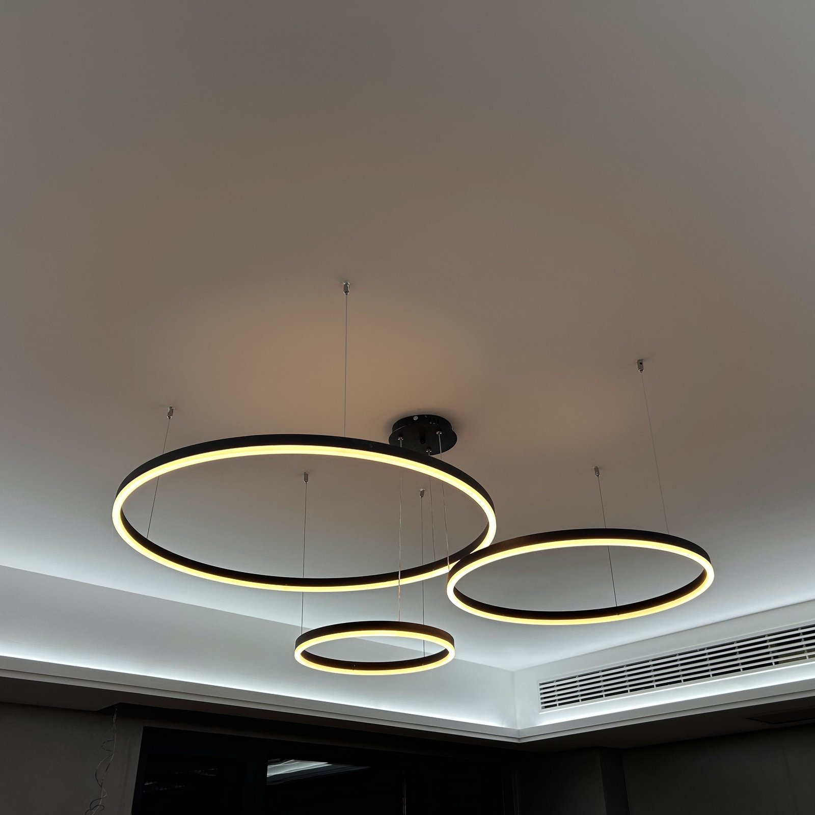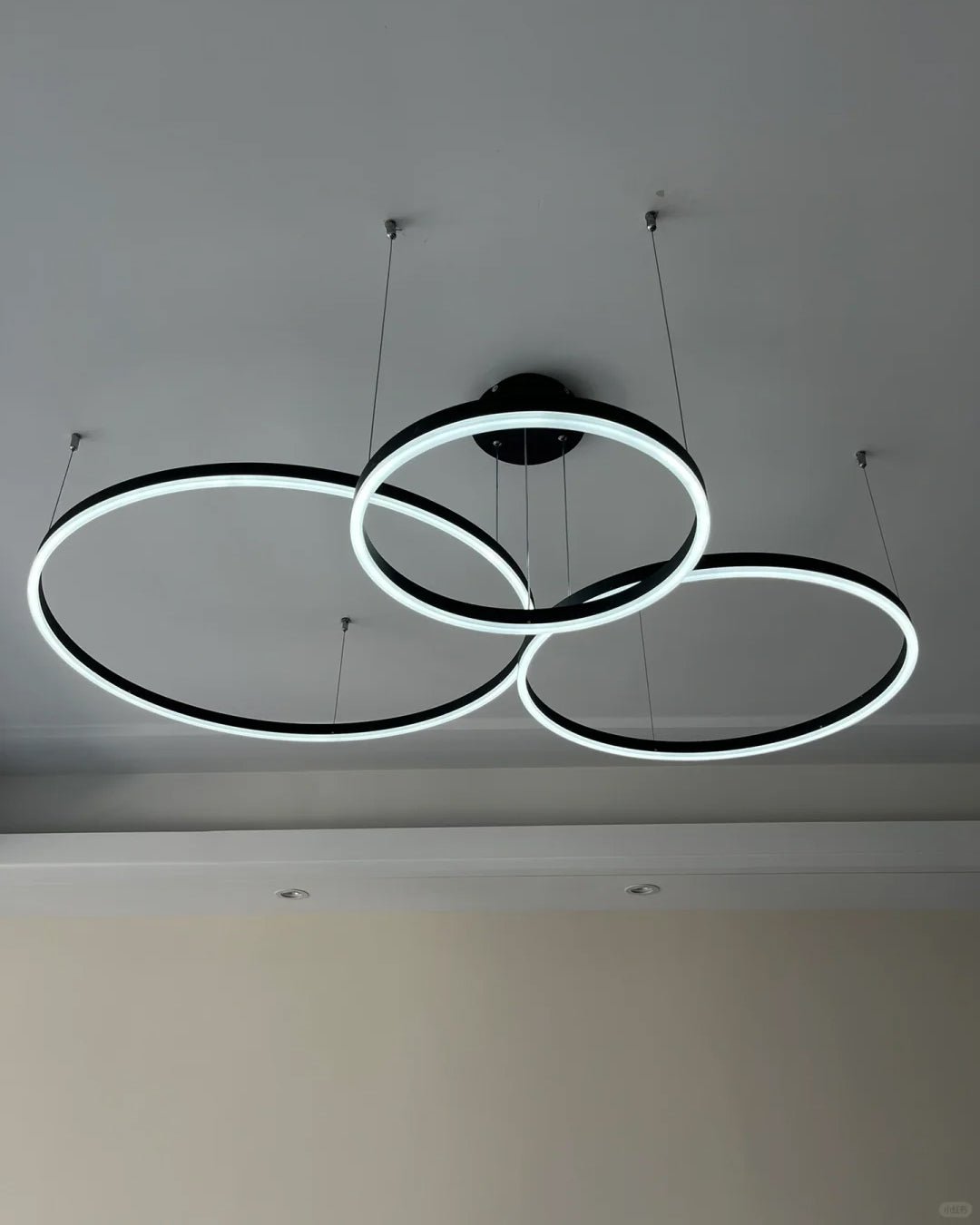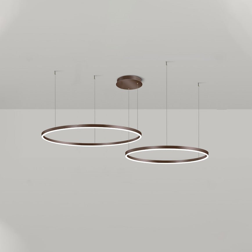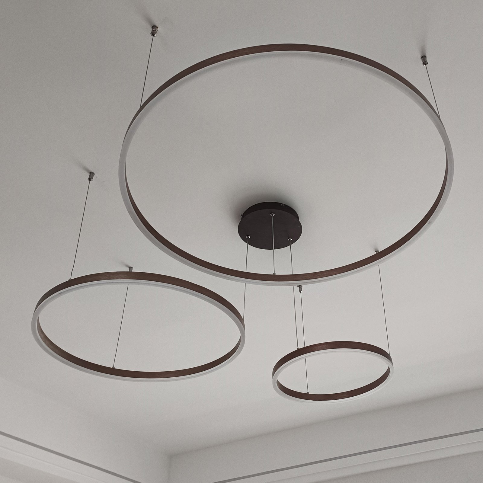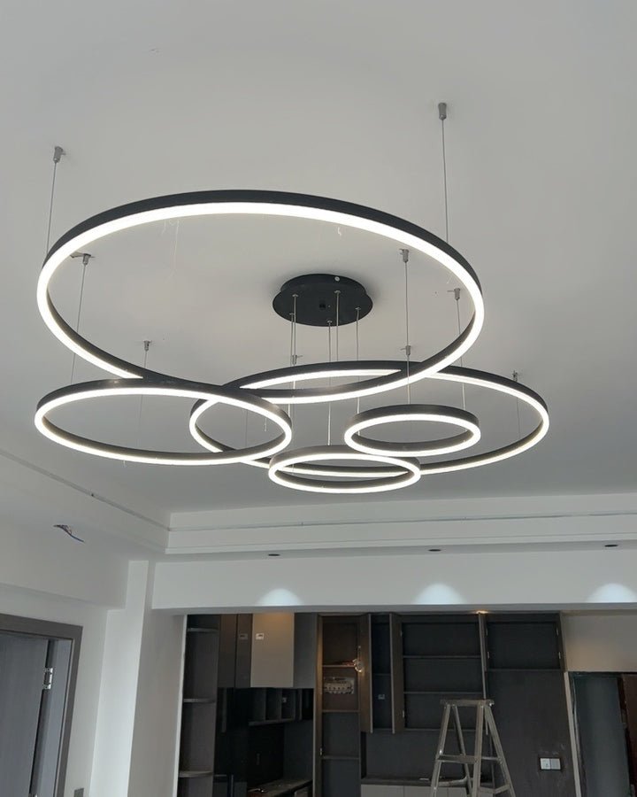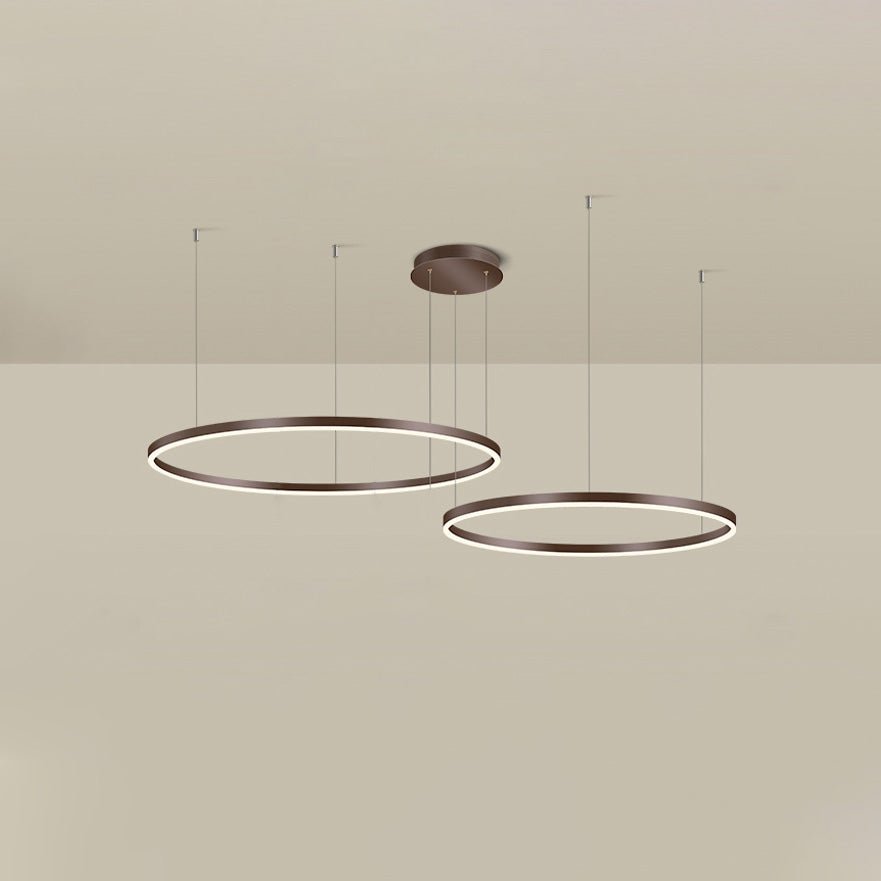 The lights in the pictures are modern circular pendant fixtures with multiple rings suspended from the ceiling. Made of metal with finishes like matte black, brown or gold, the rings are illuminated by integrated LED lights, creating a sleek, glowing effect. These fixtures add a contemporary, geometric touch to any modern space.