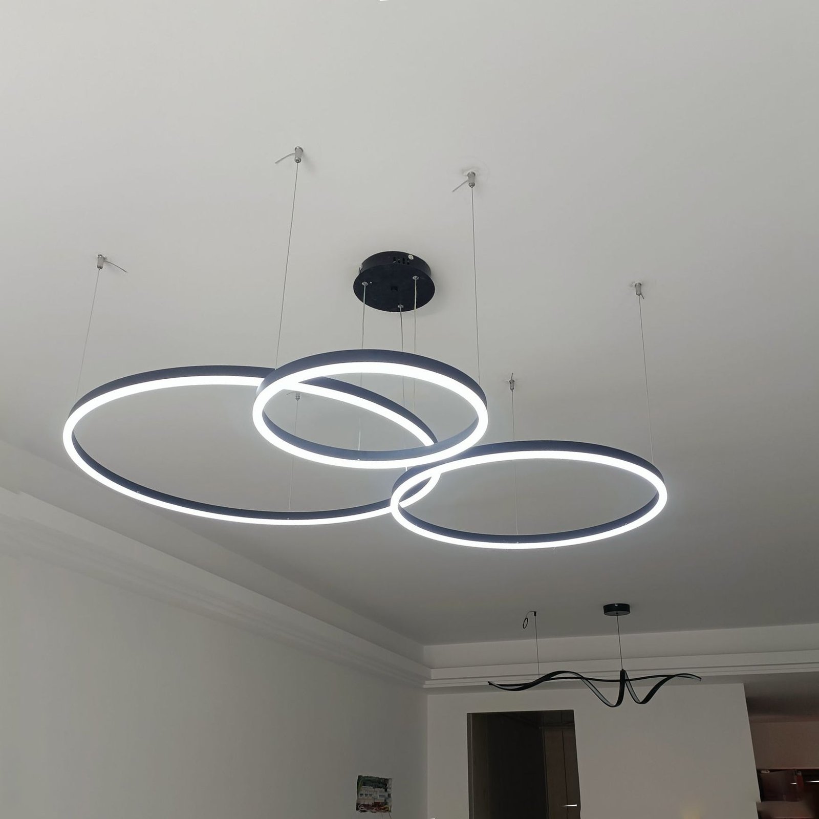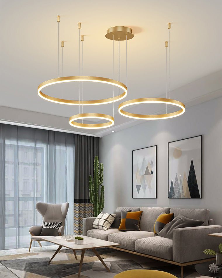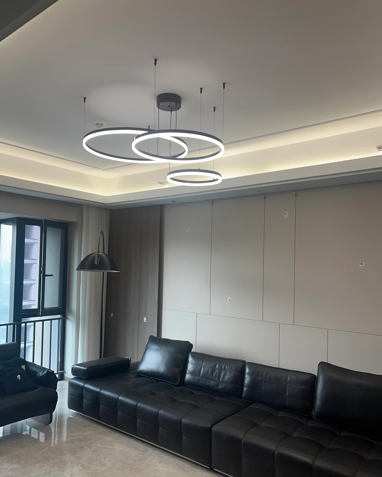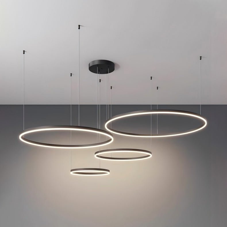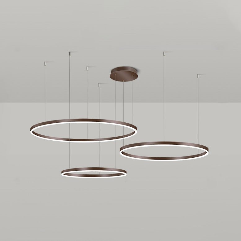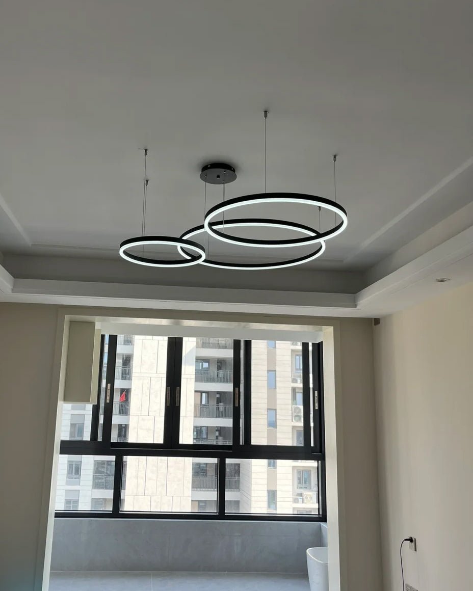 The lights in the pictures are modern circular pendant fixtures with multiple rings suspended from the ceiling. Made of metal with finishes like matte black, brown or gold, the rings are illuminated by integrated LED lights, creating a sleek, glowing effect. These fixtures add a contemporary, geometric touch to any modern space.