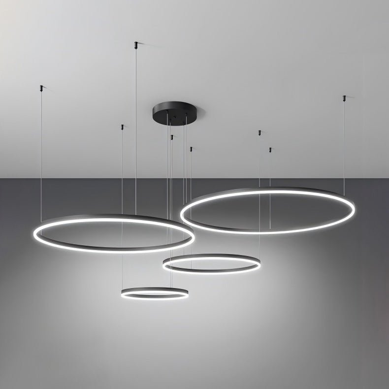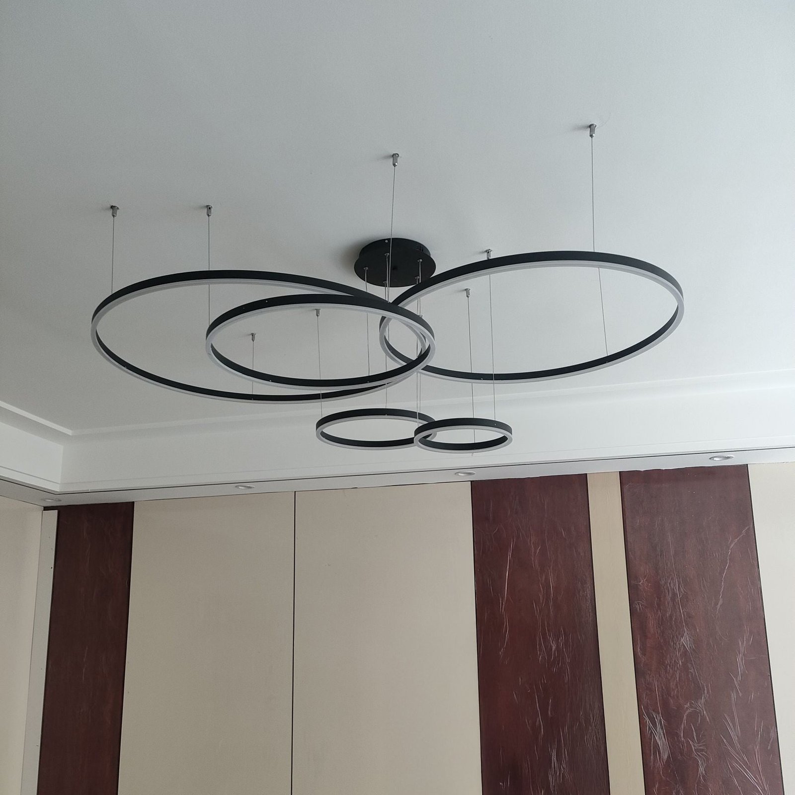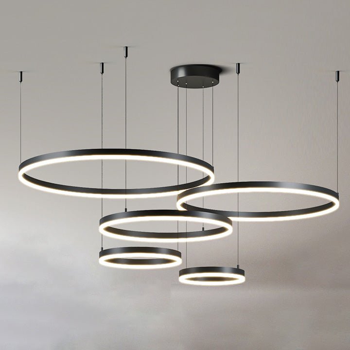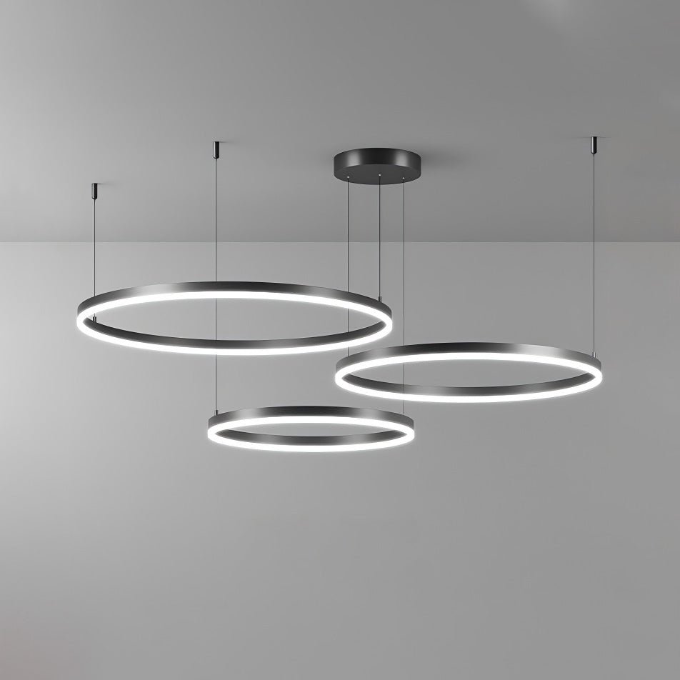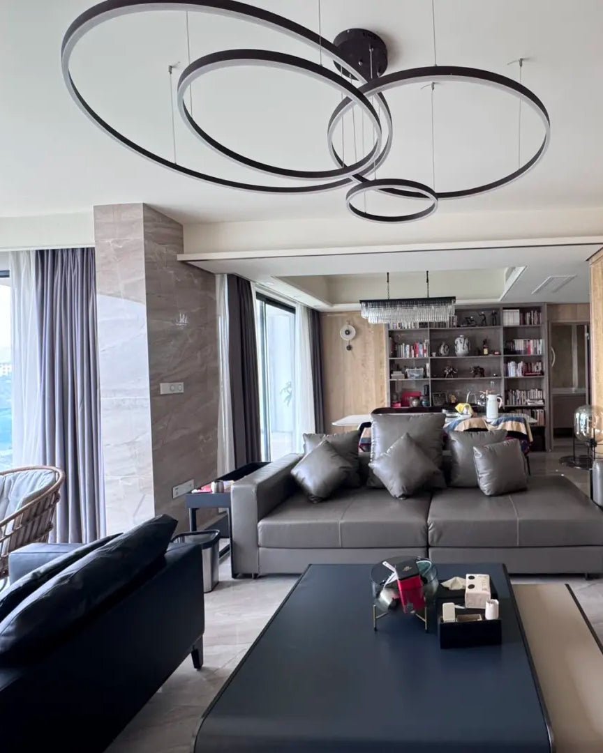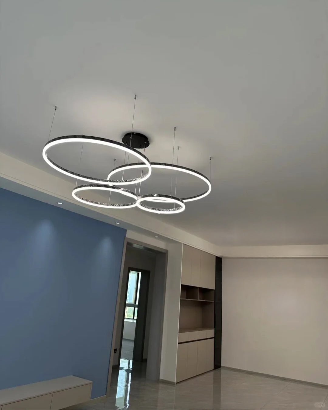 The lights in the pictures are modern circular pendant fixtures with multiple rings suspended from the ceiling. Made of metal with finishes like matte black, brown or gold, the rings are illuminated by integrated LED lights, creating a sleek, glowing effect. These fixtures add a contemporary, geometric touch to any modern space.