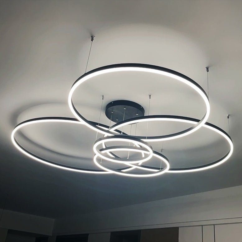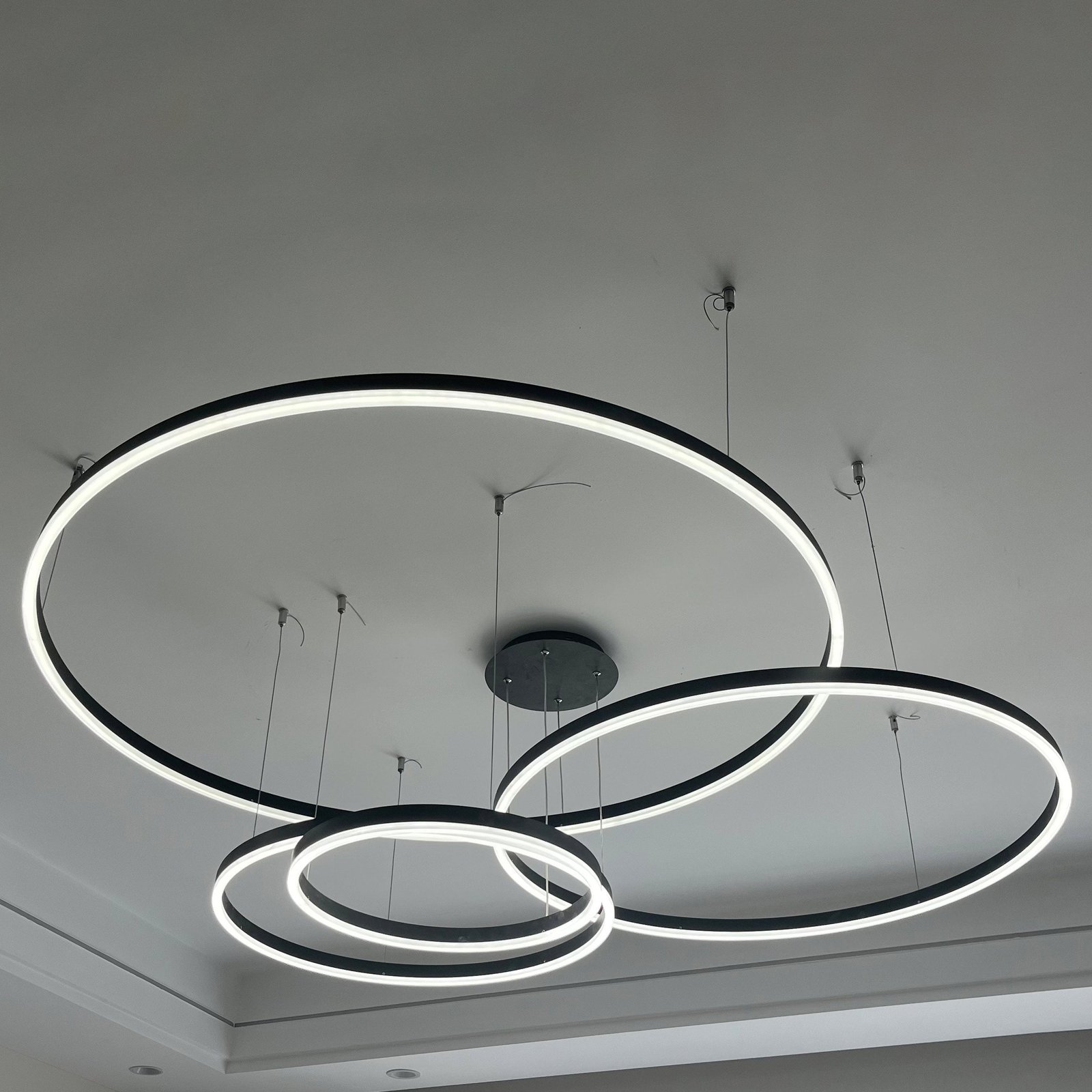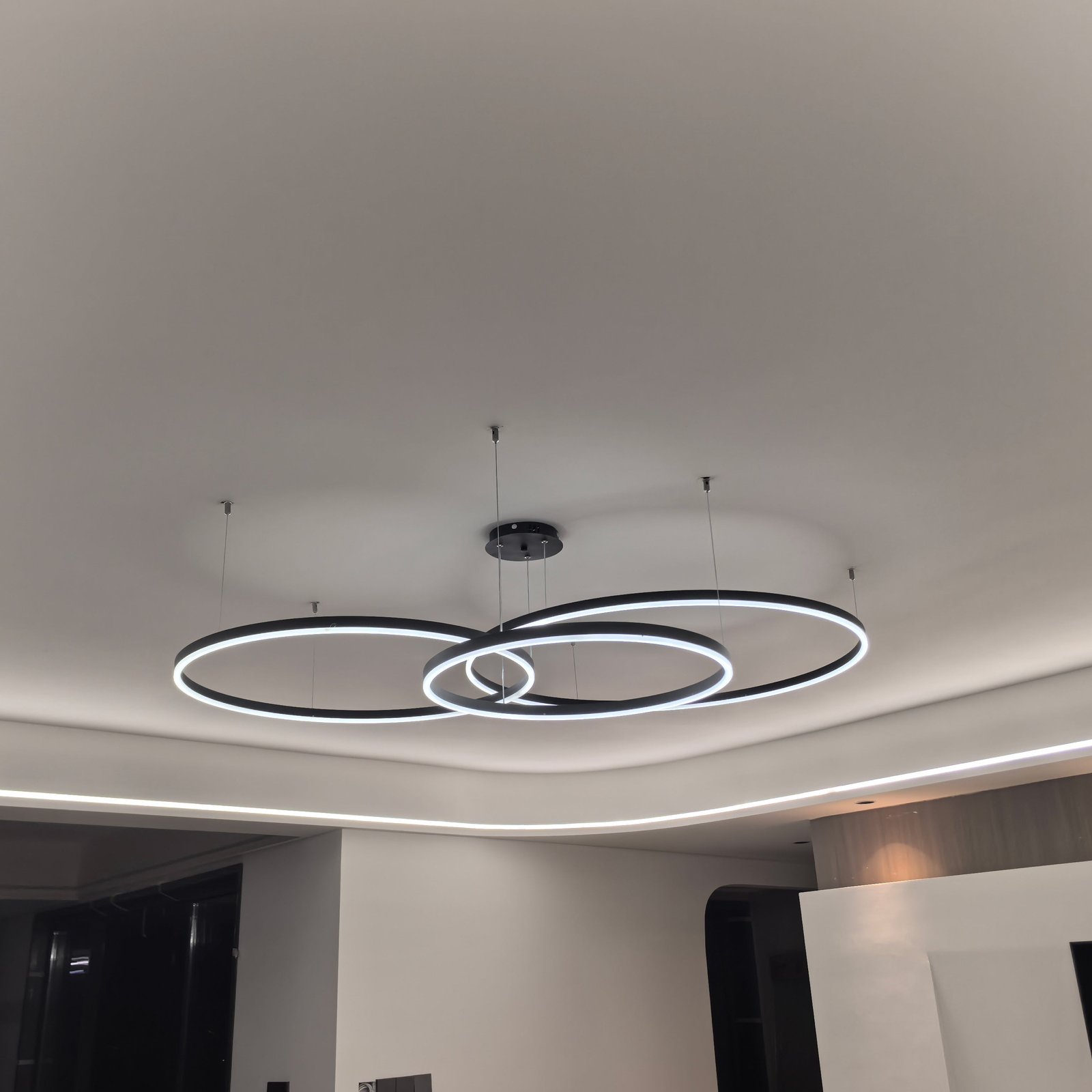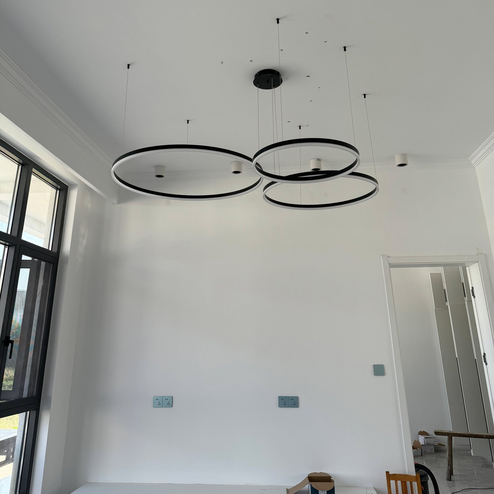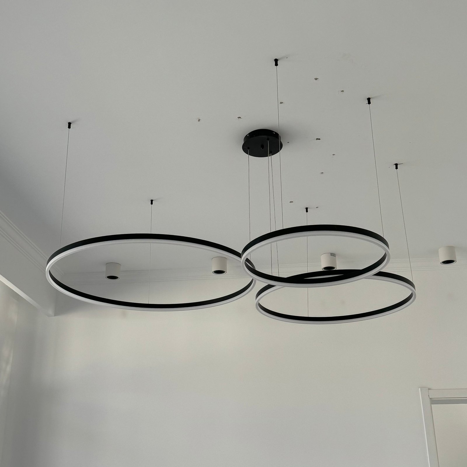 The lights in the pictures are modern circular pendant fixtures with multiple rings suspended from the ceiling. Made of metal with finishes like matte black, brown or gold, the rings are illuminated by integrated LED lights, creating a sleek, glowing effect. These fixtures add a contemporary, geometric touch to any modern space.