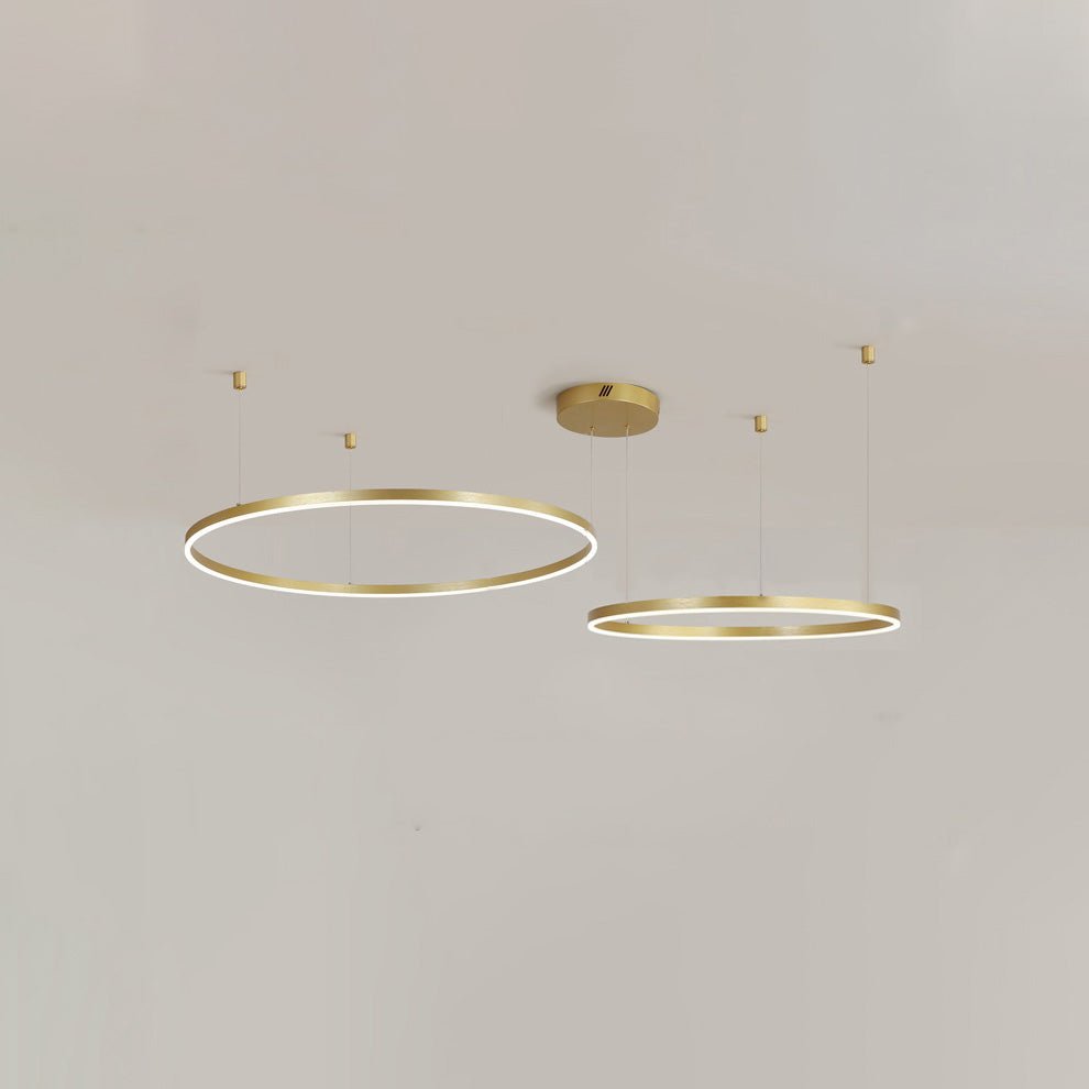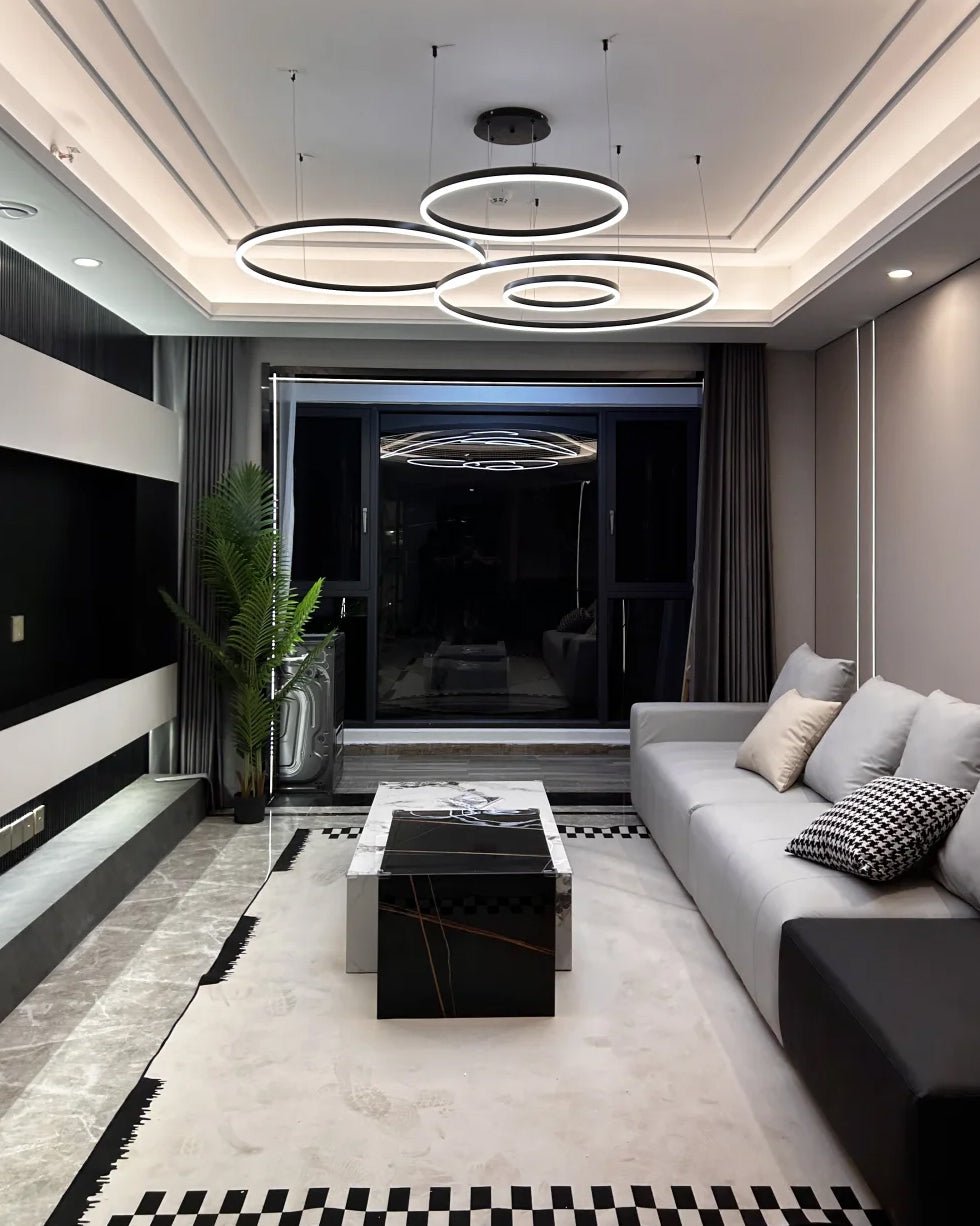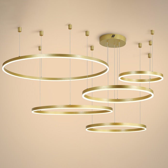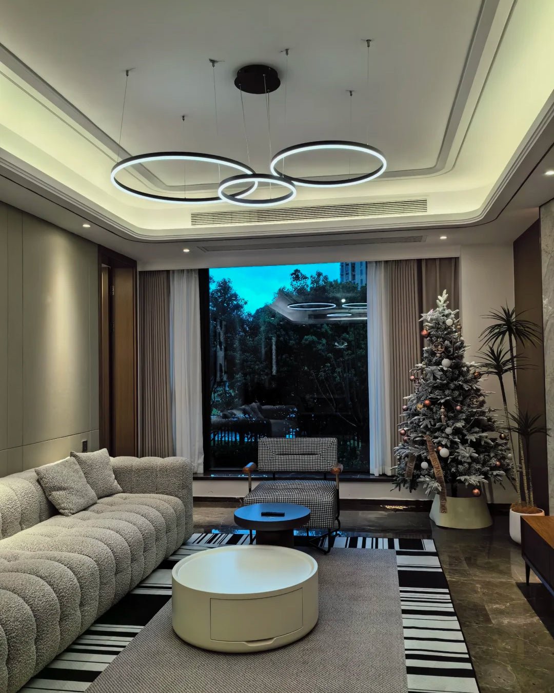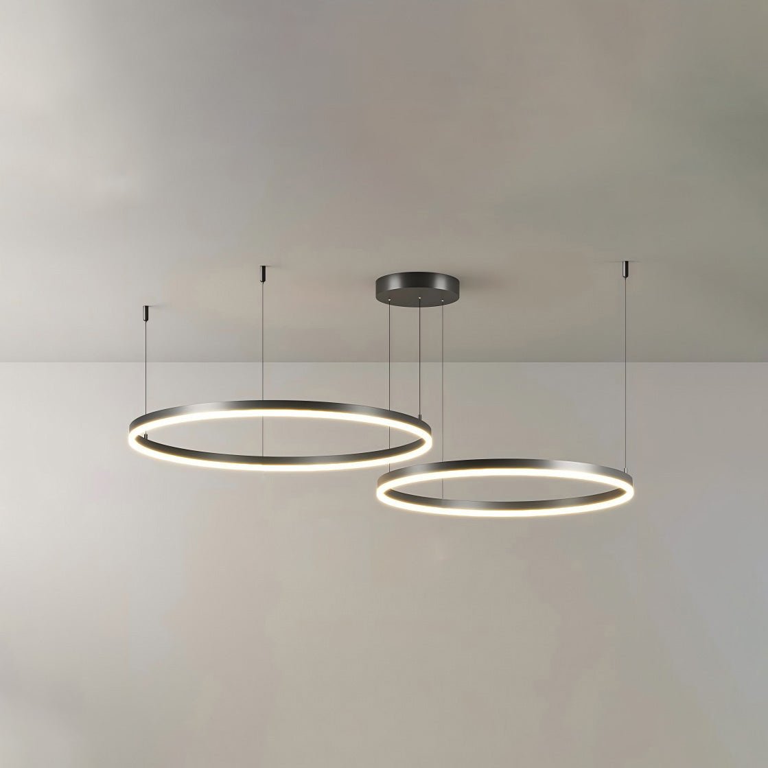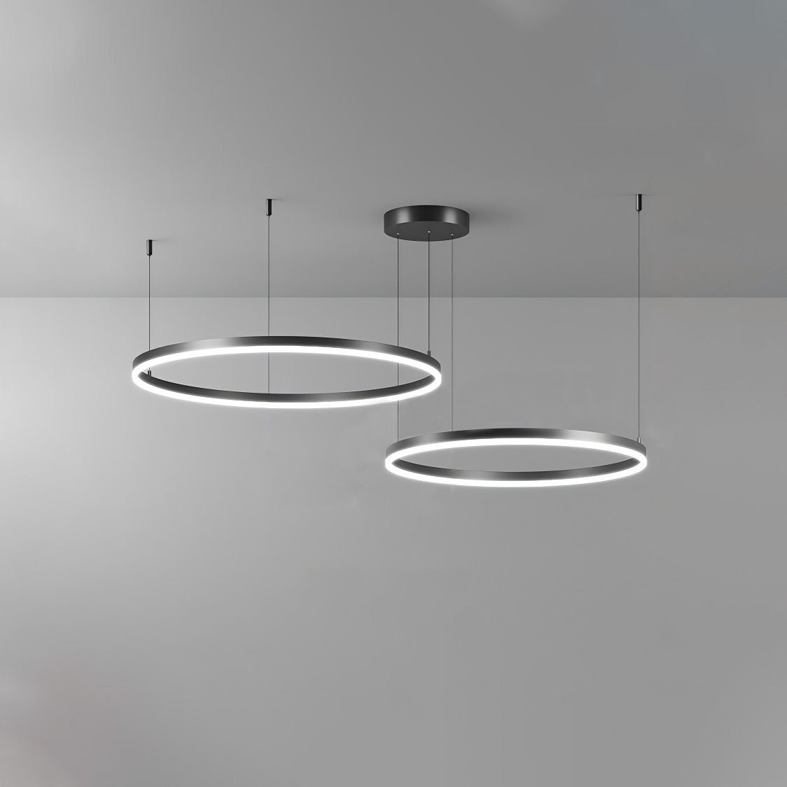 The lights in the pictures are modern circular pendant fixtures with multiple rings suspended from the ceiling. Made of metal with finishes like matte black, brown or gold, the rings are illuminated by integrated LED lights, creating a sleek, glowing effect. These fixtures add a contemporary, geometric touch to any modern space.