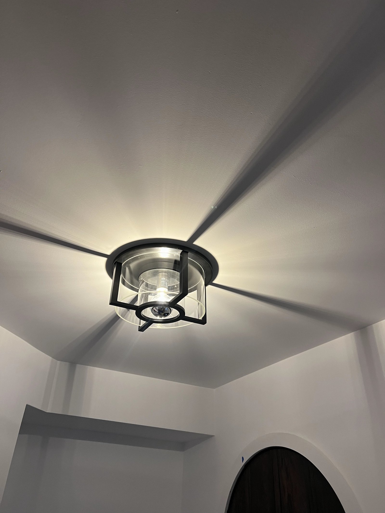 Browning erected a clear glass envelope in a linear metal frame. An interior cylindrical lampshade creates a geometric play in shapes.