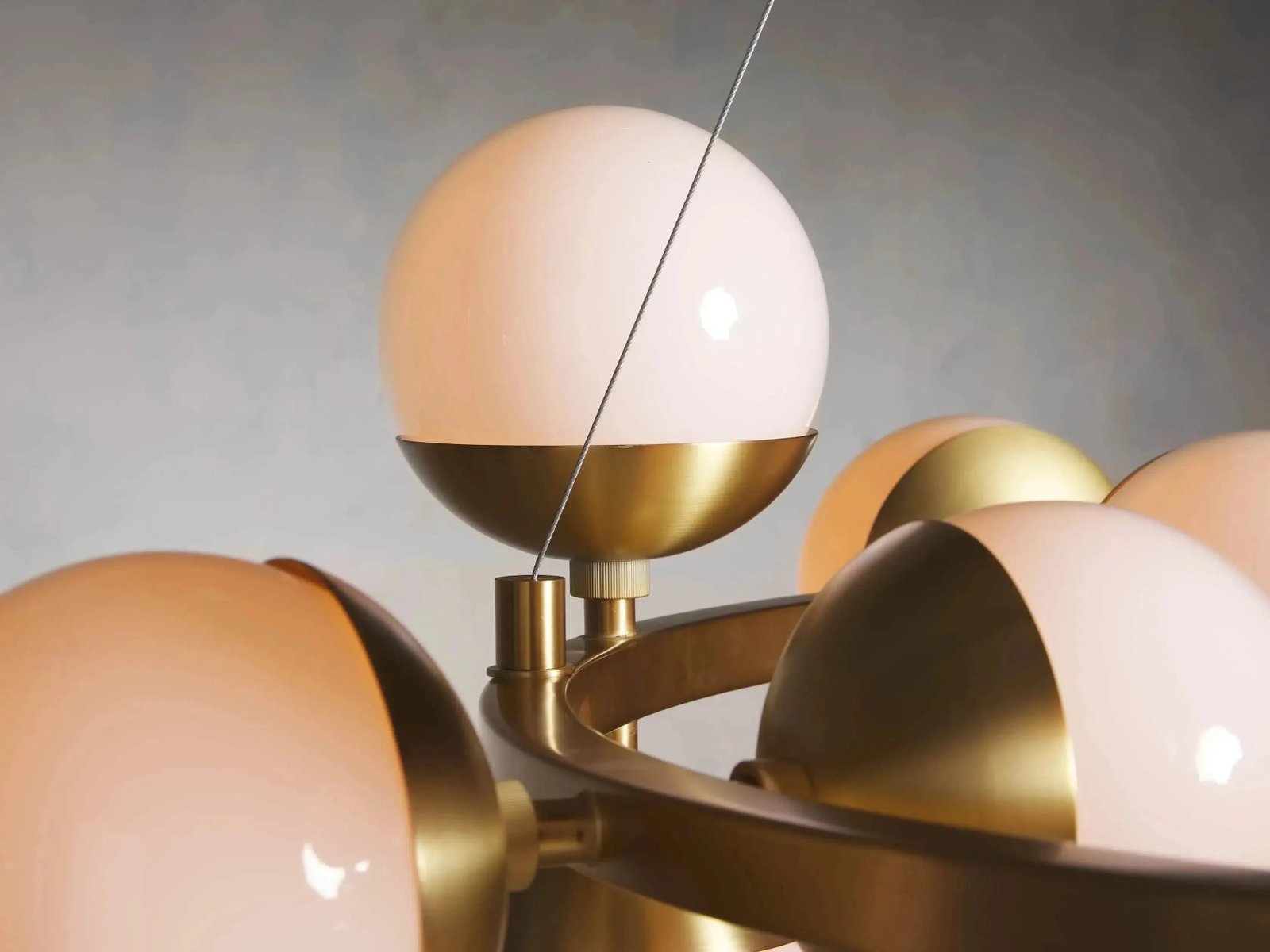 - Featuring sixteen milk glass globes, our Raechelle Chandelier is crafted with a steel frame in a polished brass finish, suspended by solid steel cables to complement any contemporary living space, foyer, or dining table.