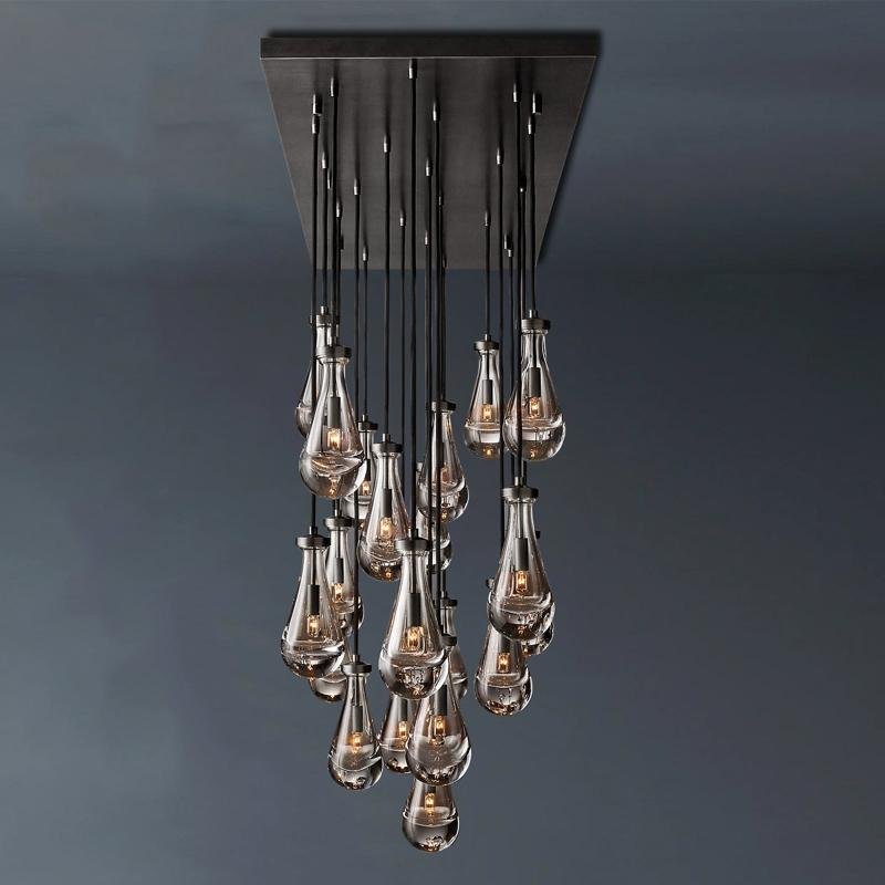 Our Raindrop Linear Chandelier is a captivating piece with raindrops that look like raindrops. Handcrafted from blown glass and a metal frame, this fixture is lit to refract a rich light effect, creating the illusion of underwater lighting.