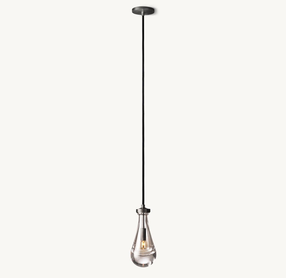 Master glass designer has created a dramatic evocation of rain in this inspired collection. Suspended from a slim frame, a single drop of blown glass encases the bulb, casting a luminous glow.