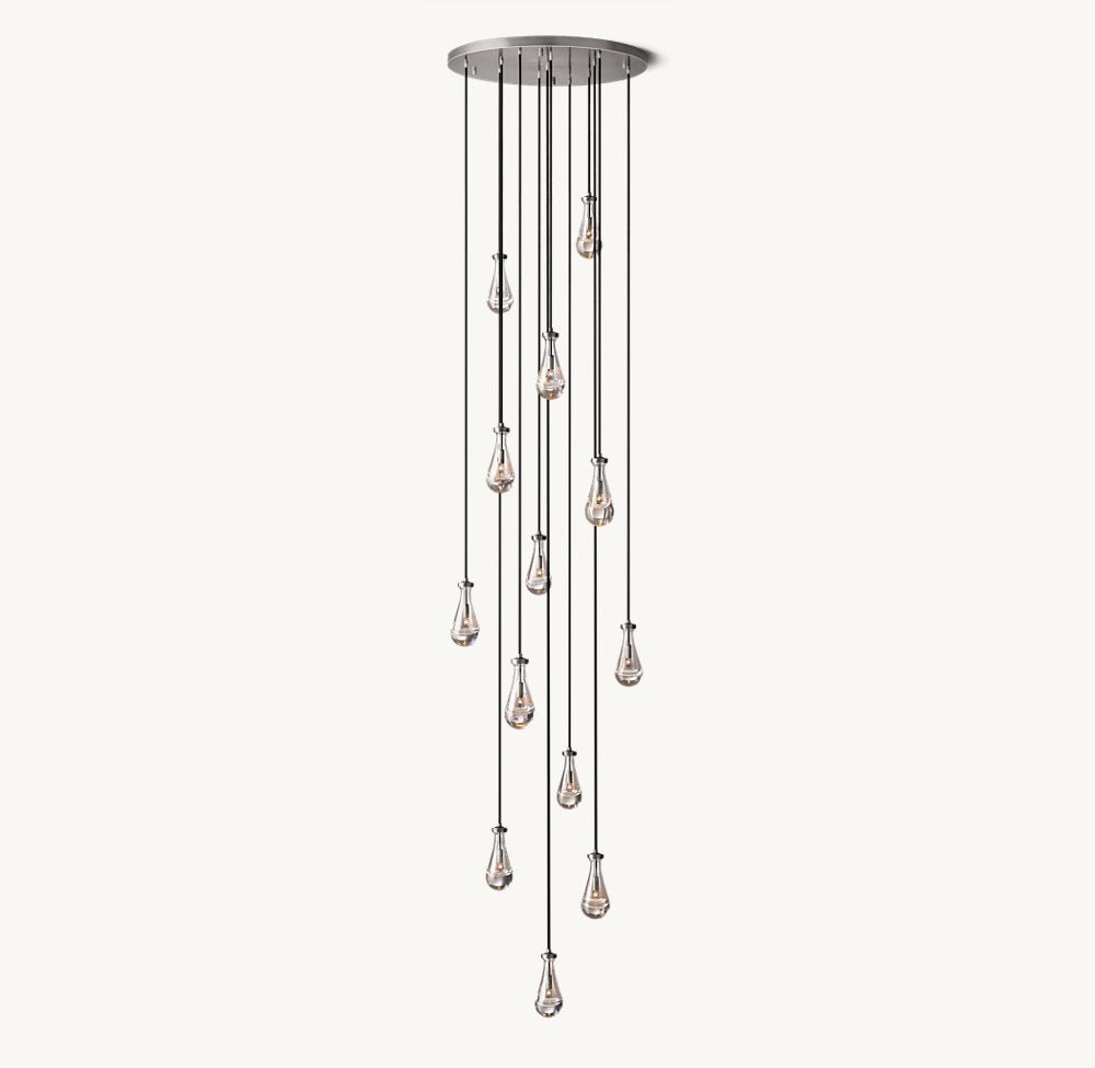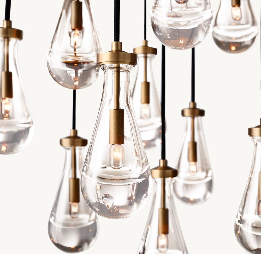 Master glass designer Alison Berger has created a dramatic evocation of rain in this inspired collection. Suspended from slim black cords, drops of blown glass encase the bulb, casting luminous ripples that wash across ceilings and walls.