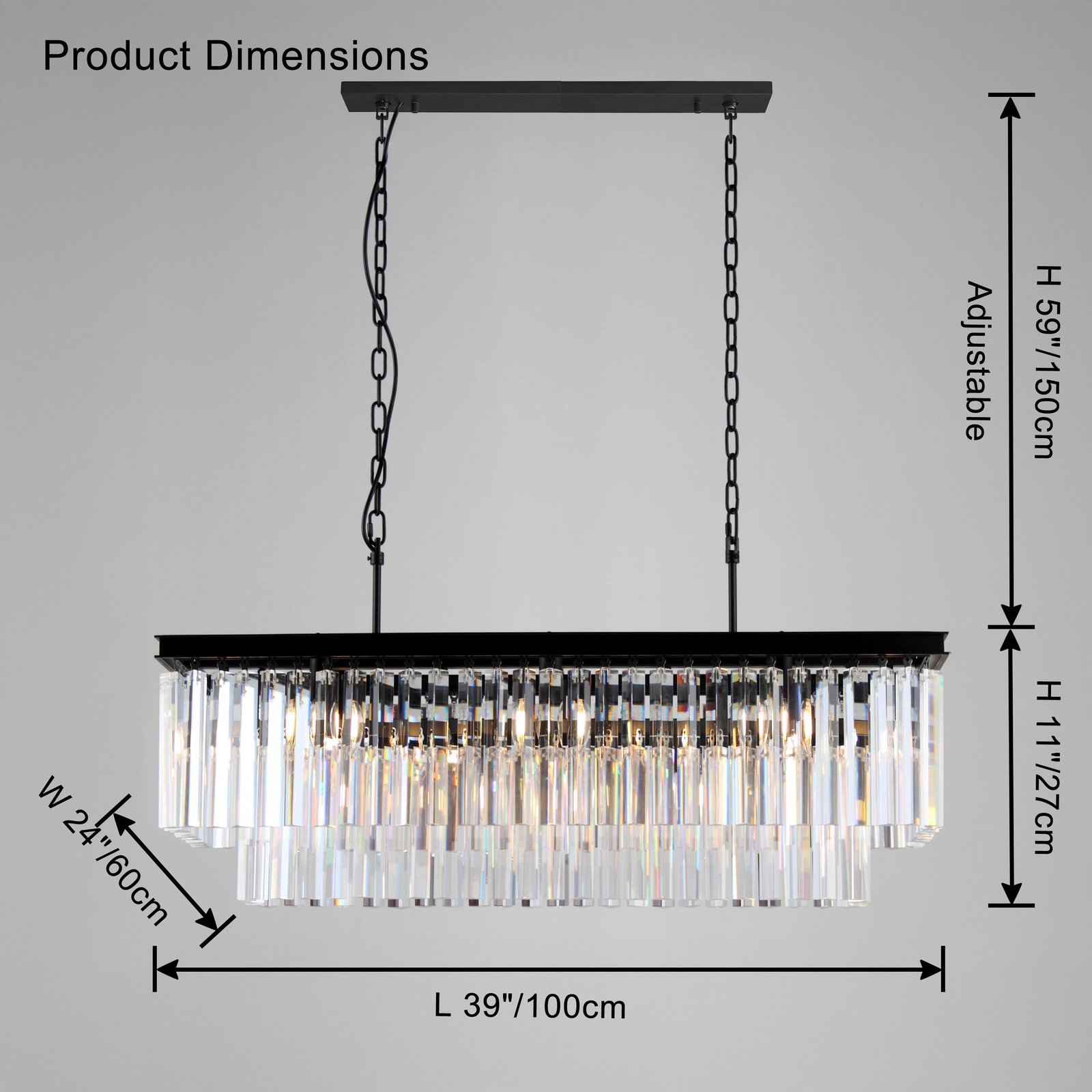 Elevate your dining room with the luxurious beauty of our jucci Rectangular Crystal Chandelier-WM2589. Featuring two tiers of sparkling crystals in an art deco inspired design, this chandelier adds an elegant touch to any space. Available in a sleek black or gold finish, it’s the perfect statement piece for any modern home.