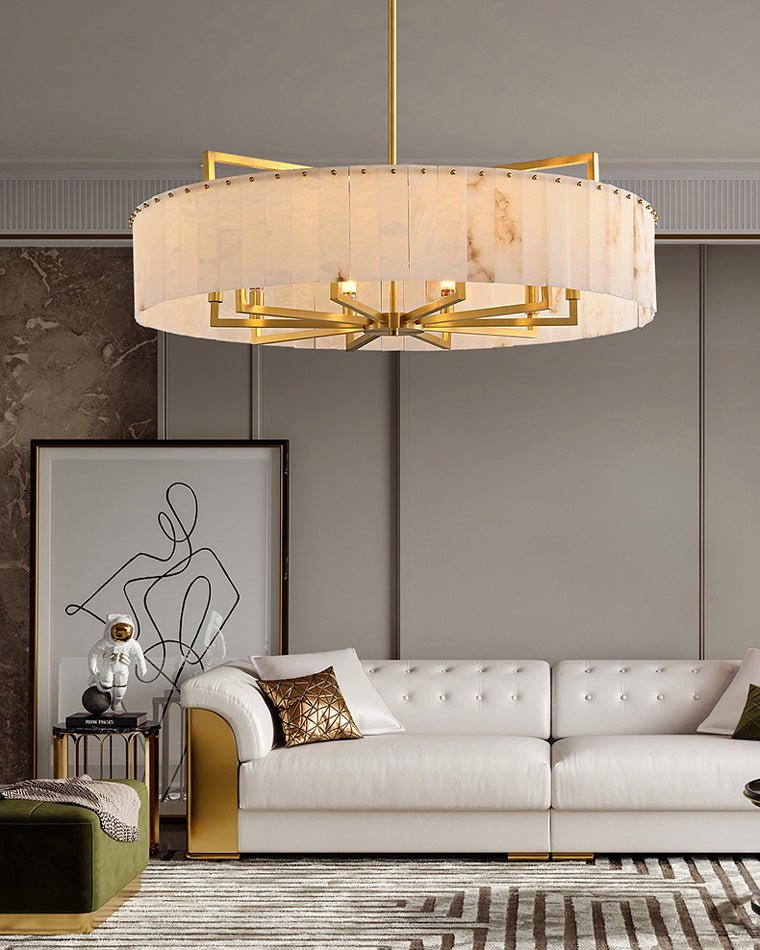 Elevate any space with our chic jucci Round Alabaster Chandelier! Featuring a contemporary design, this chandelier boasts luxurious alabaster and gold details, making it a perfect addition to your dining room, bedroom, or living room. Add sophistication and elegance to your home with this must-have lighting fixture!