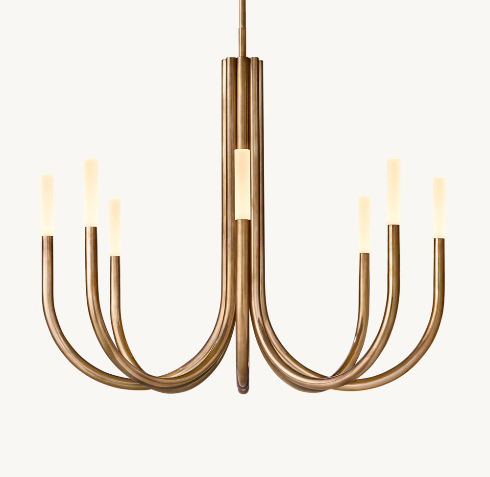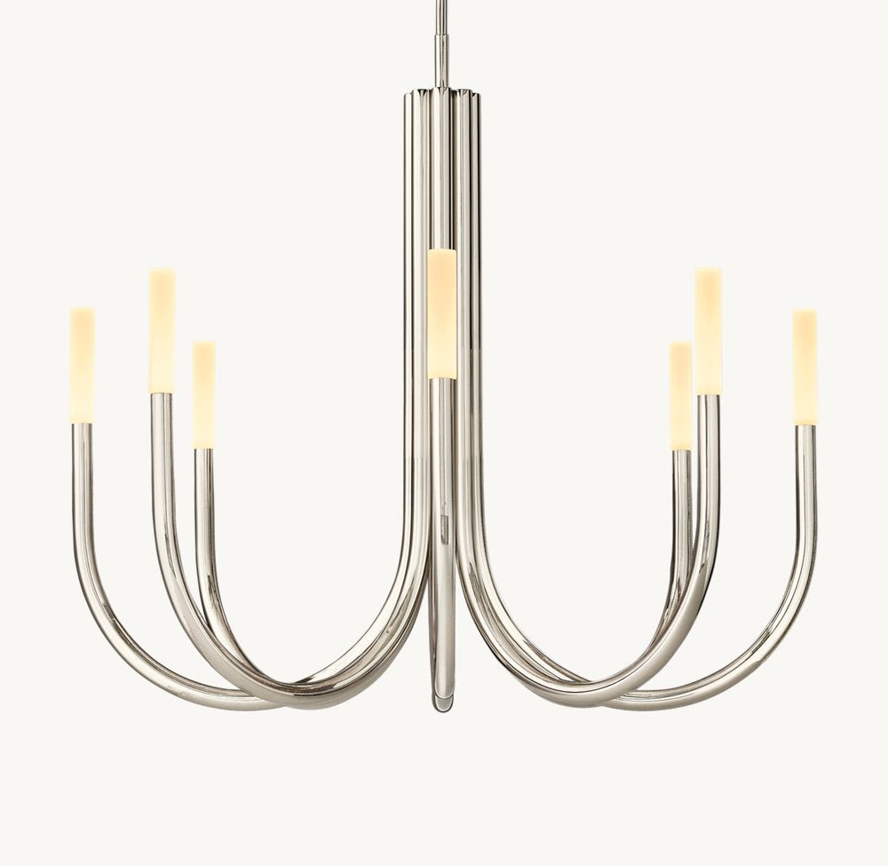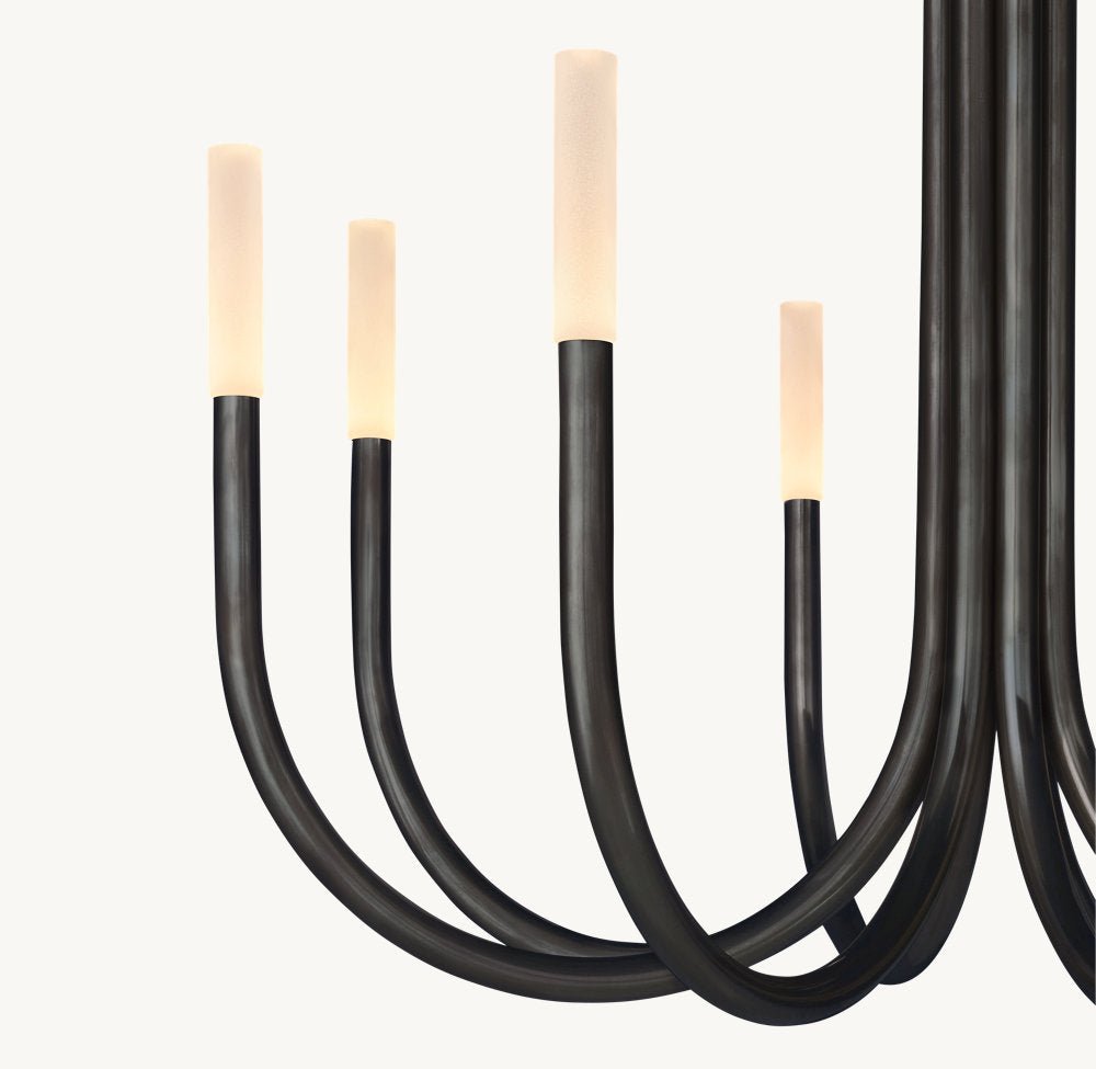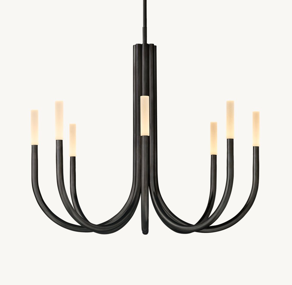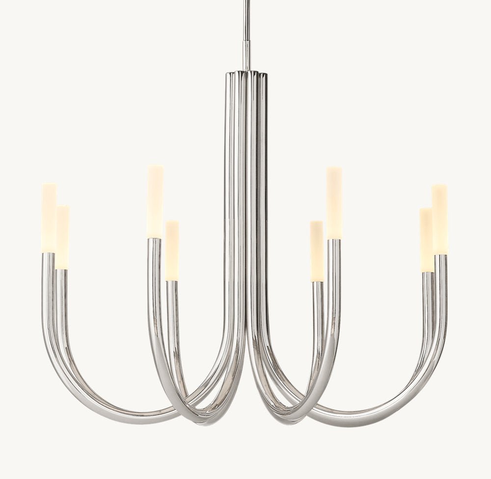 Inspired by minimalist midcentury Italian design, our contemporary interpretation of the chandelier offers reductionist form in a striking silhouette. Spare and understated, Rousseau’s gracefully upraised arms hold aloft an etched glass shade fitted with an integrated LED bulb. When lit, the fixture emits a warm, filtered glow.