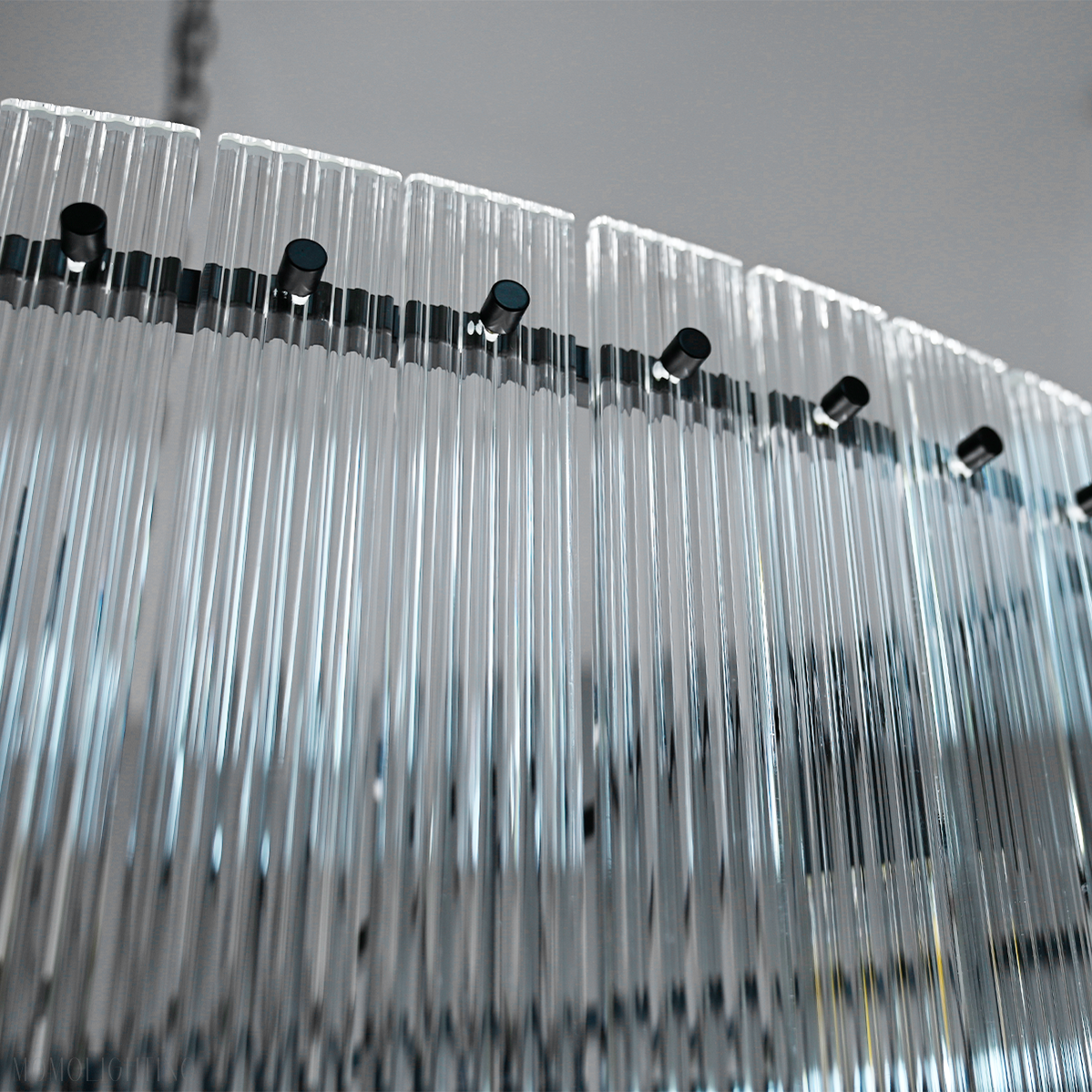 This crystal chandelier captures the period’s fascination with geometric forms. Hundreds of faceted dynamic prisms subtly refract light, evoking the allure of the industrial age. Suspended like lush tassels on a welded iron frame, the angular crystal glass juxtaposes elegance and industrialism.