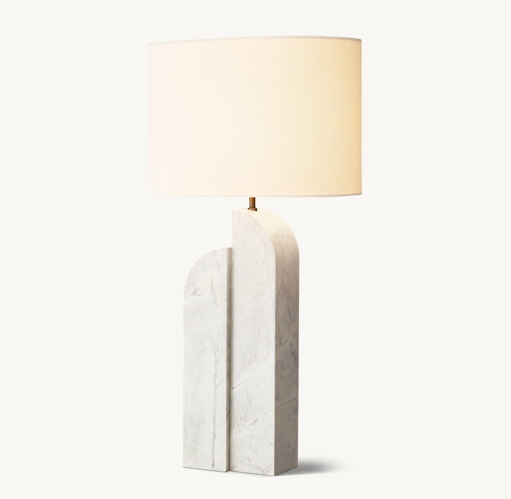 Handcrafted of honed alabaster or marble, the Savoye lamp combines two curved columns into one sculptural base, the staggered form calling to mind tectonic movement along a fault line. Informed by postmodernist design, the fixture casts warm, directional light down through the translucent stone.