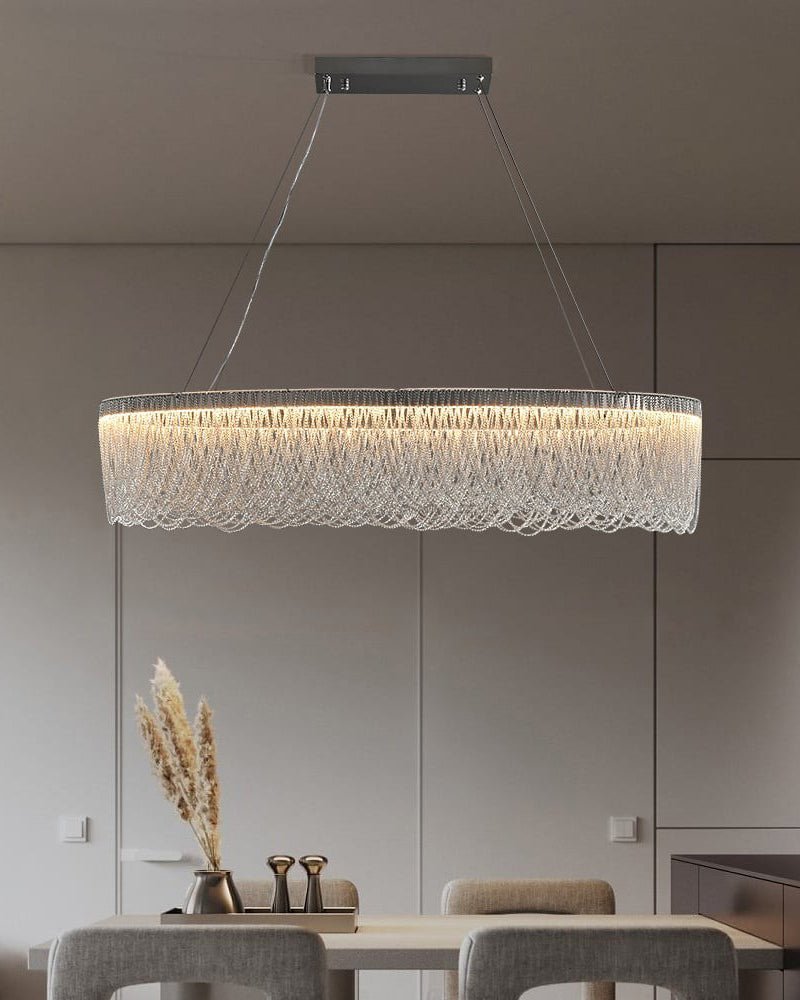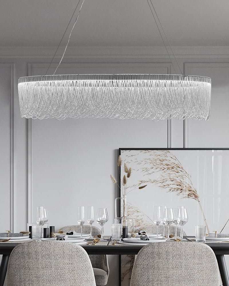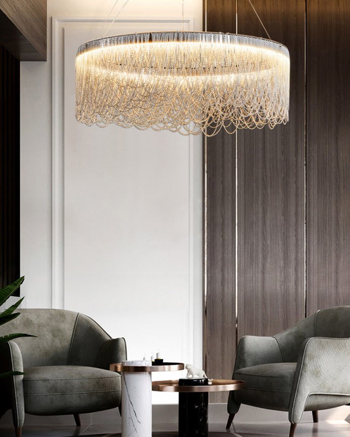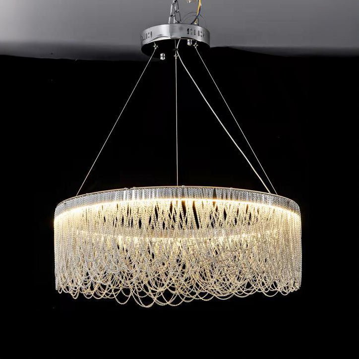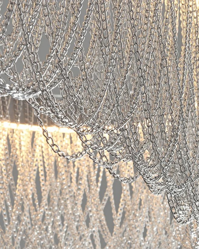Elevate your dining or living space with the timeless elegance of the jucci Silver Fringe Round Chandelier. Its striking silver fringe and art deco design make a statement that will elevate any room. Perfect for adding a touch of glamour and sophistication to your decor.