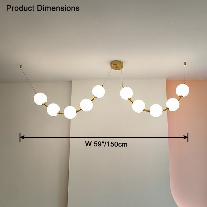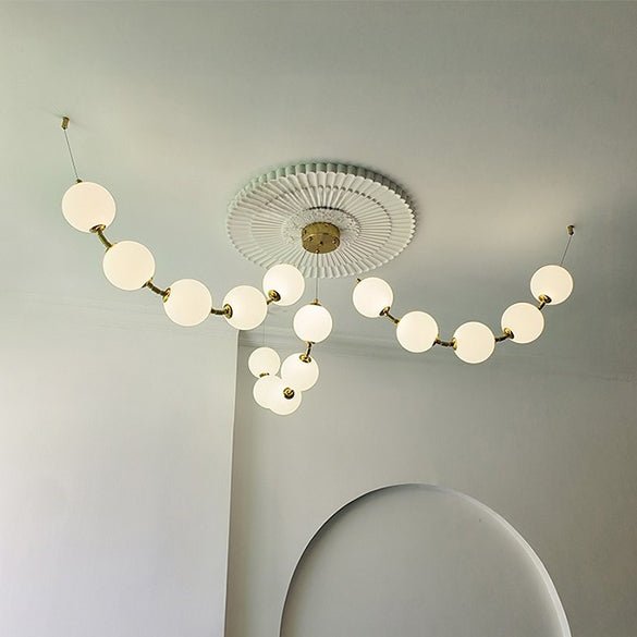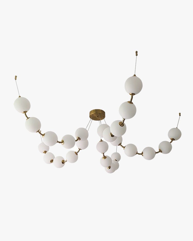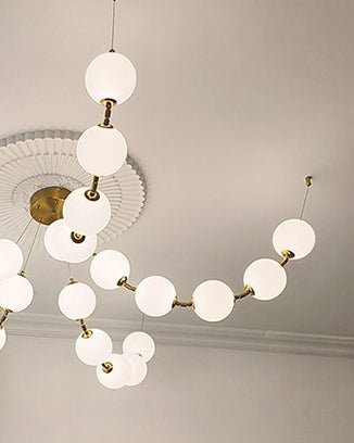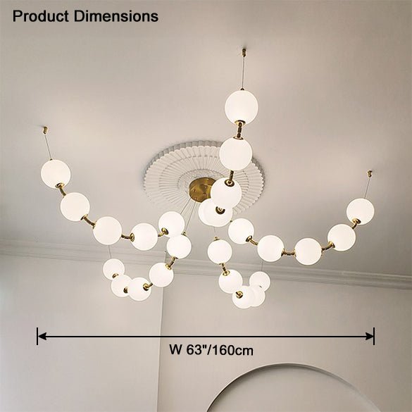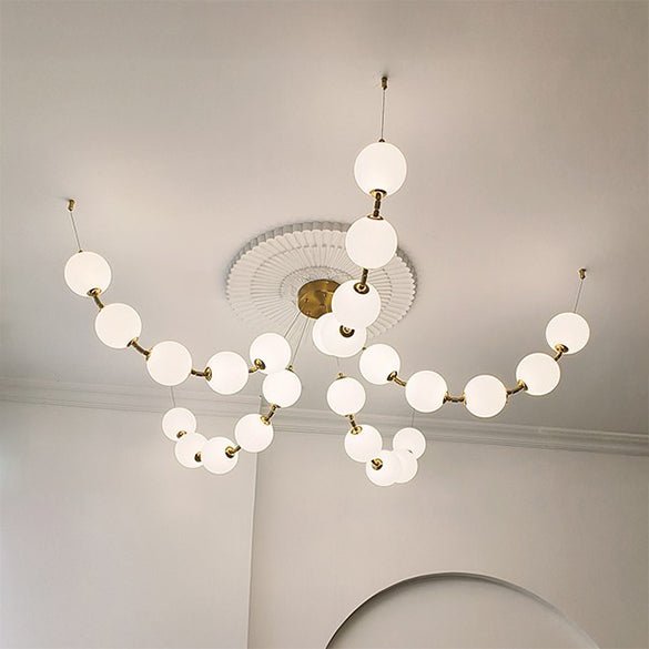 The jucci Spider Pearl Globe Chandelier is the perfect addition to any living room. This stunning piece features a string of acrylic balls in a rich gold finish, adding a touch of art deco elegance to your space. Upgrade your home decor with this captivating chandelier.