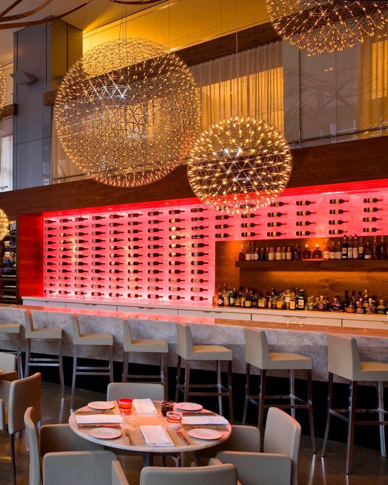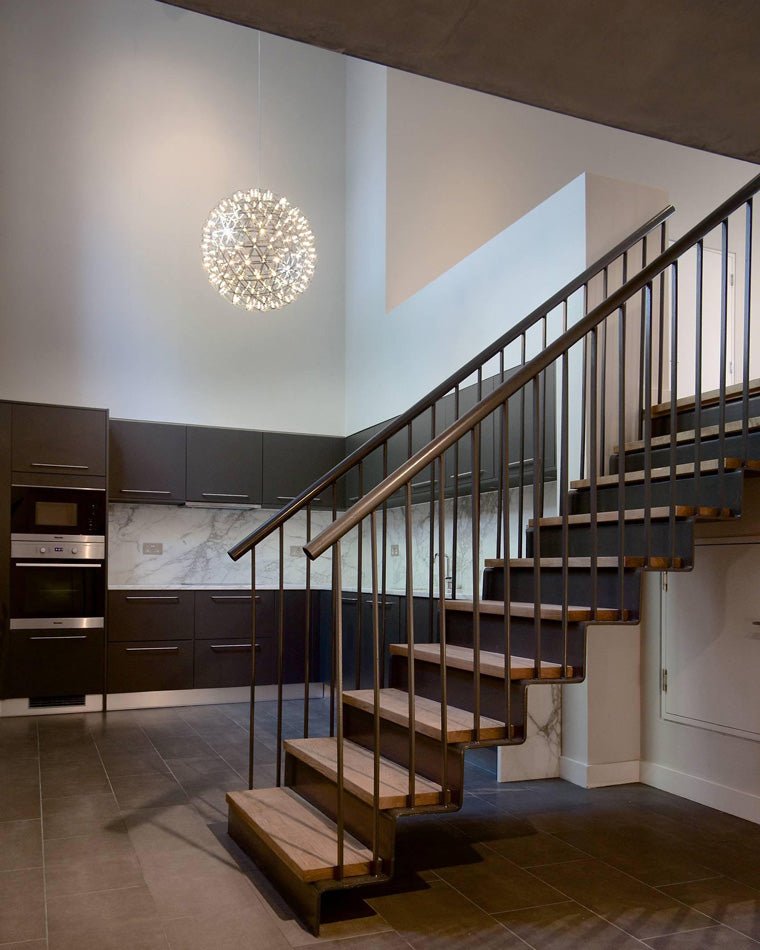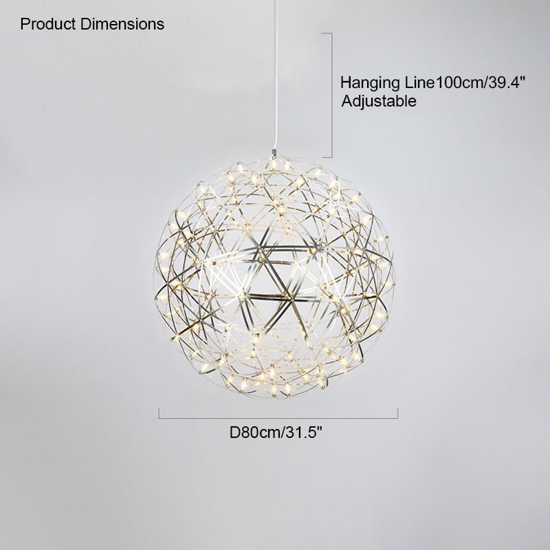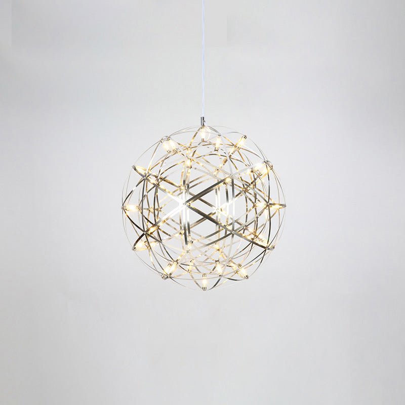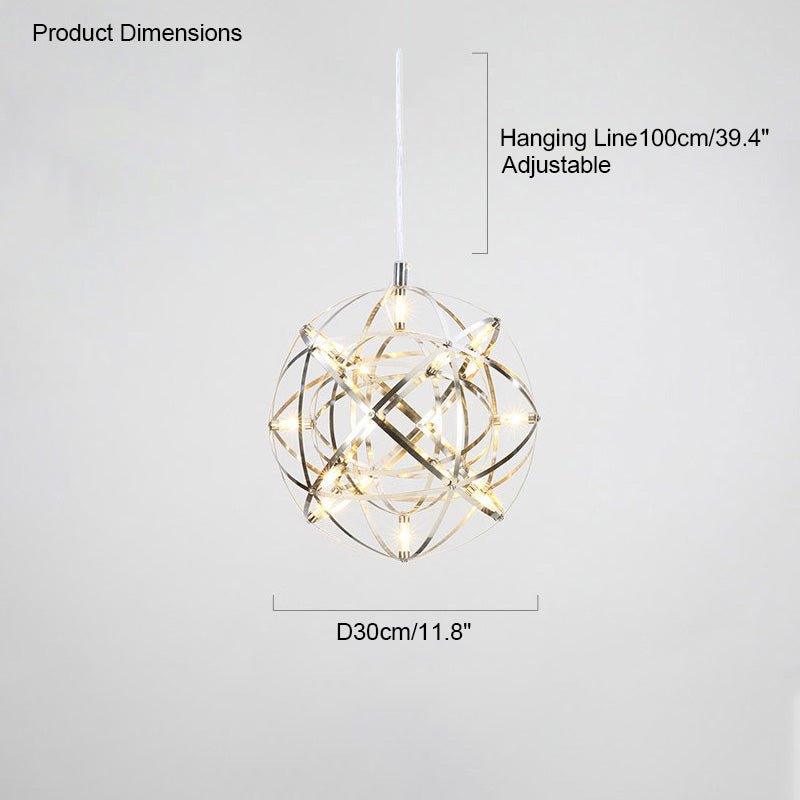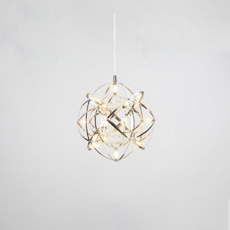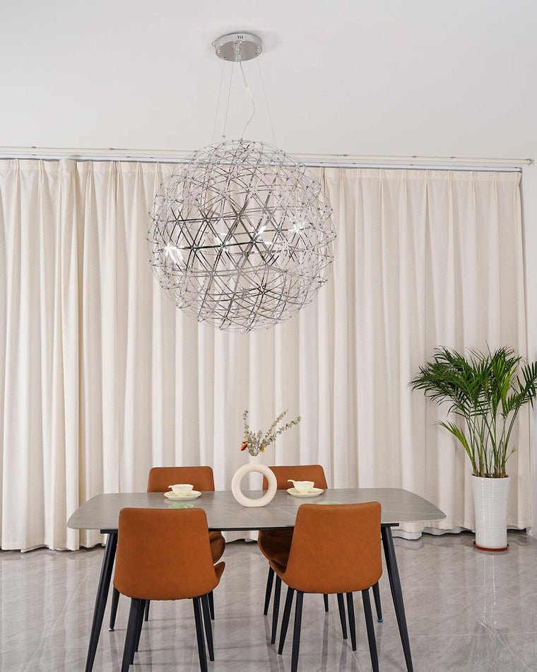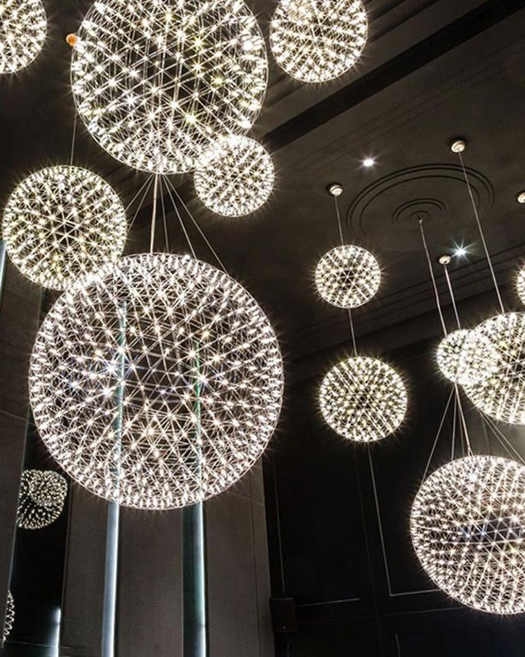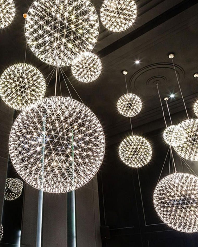 The Sphere Chandelier features intricate spheres transporting the safety electrical current through a stainless steel frame. Individually or as a system, raimond transforms your room into a unique ambience. Hanging from the ceiling, Raimond Lamps seem to recreate a starry sky, and that was exactly the effect the mathematical designer whose name these original elastic steel spheres bear wanted. A perfect sphere resulting from precise mathematical calculations, dotted with tiny LED lights. The result is a pleasant diffuse white light to bring sophistication and elegance of modern design to any restaurant, kitchen, dining room, living room, bedroom, vaulted ceiling, staircase, and more.