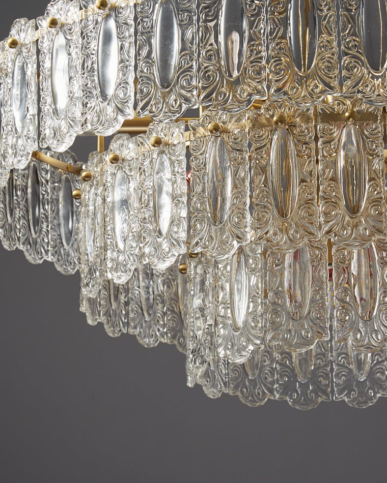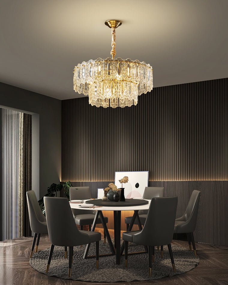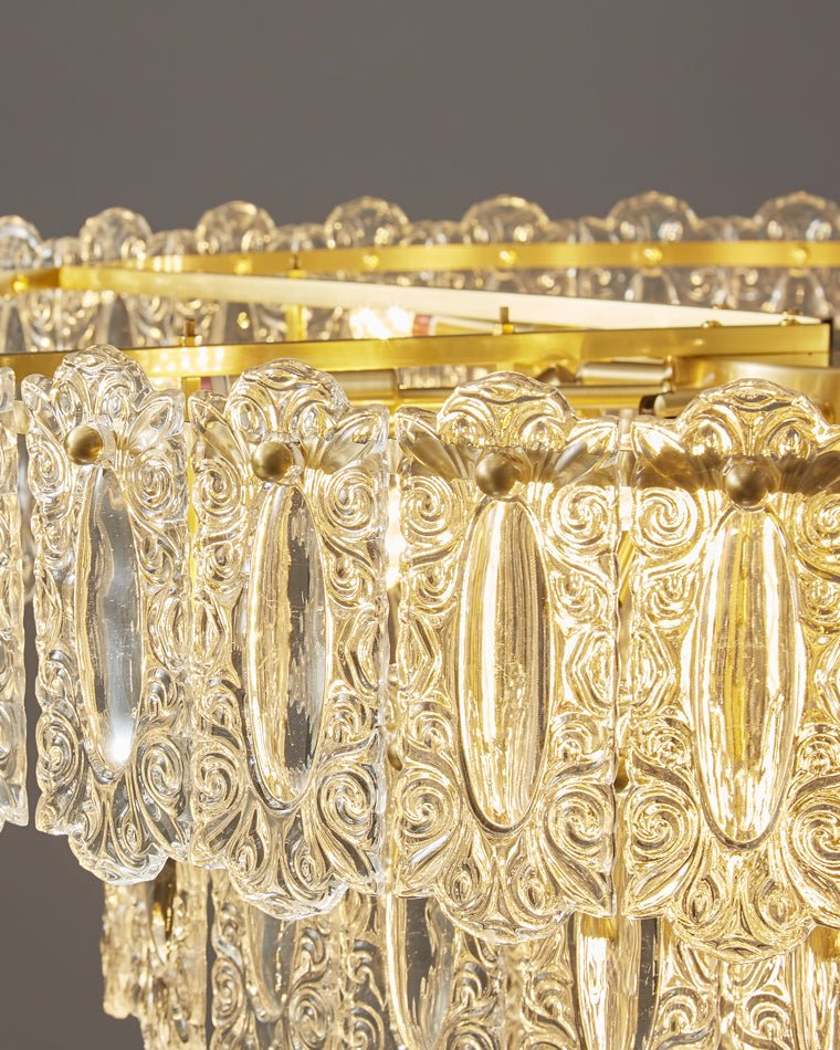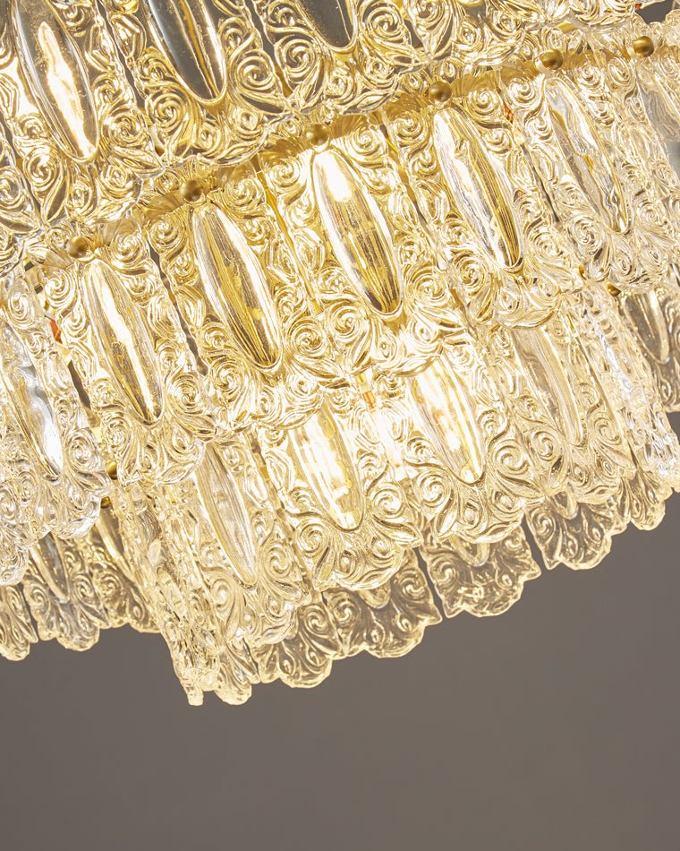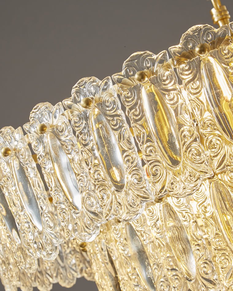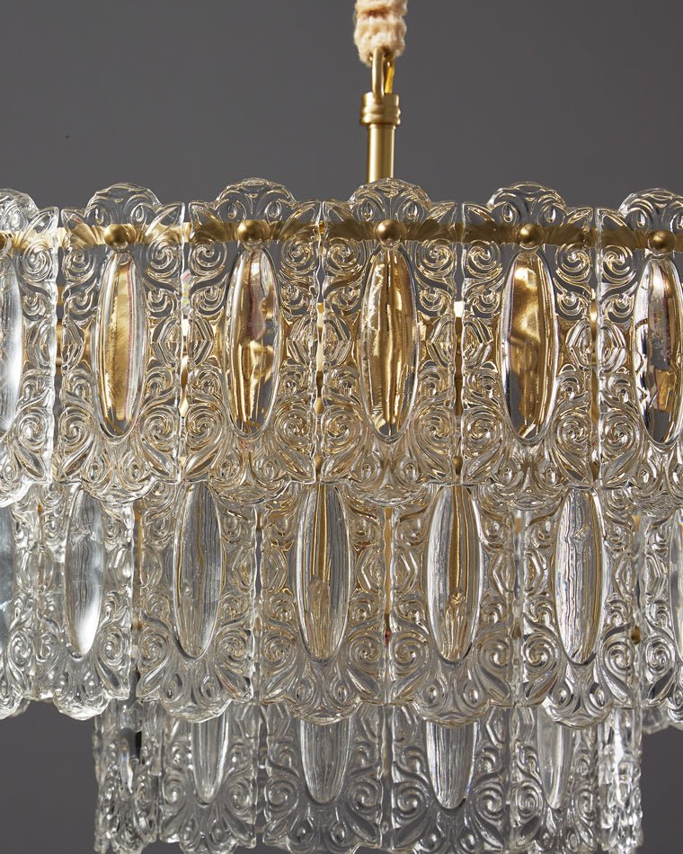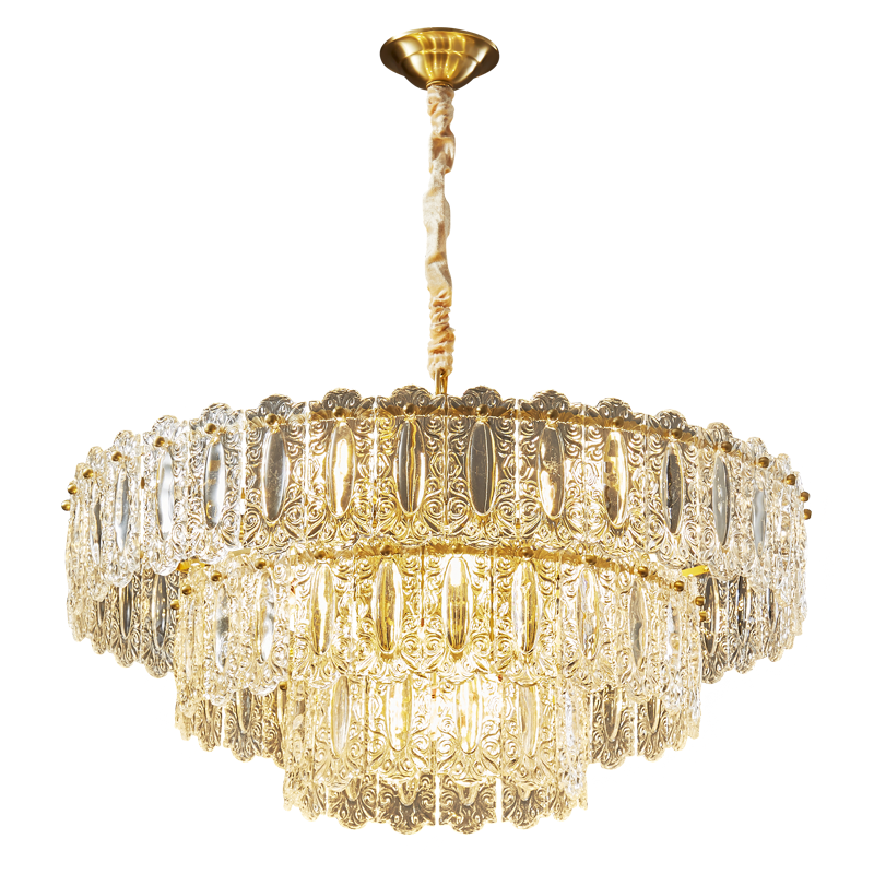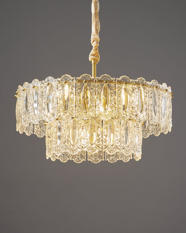 Add Splendor and Luxury Style to your home with the jucci Tiered Textured Glass Chandelier. The refined contrast of clear textured glass and brass create quite a spectacle when its six lights are illuminated. Even when not lit, its sparkling wedge silhouette is something to behold. Transform a traditional living room, dining room, kitchen island, bedroom into a glamorous showcase with this gold and crystal chandelier.