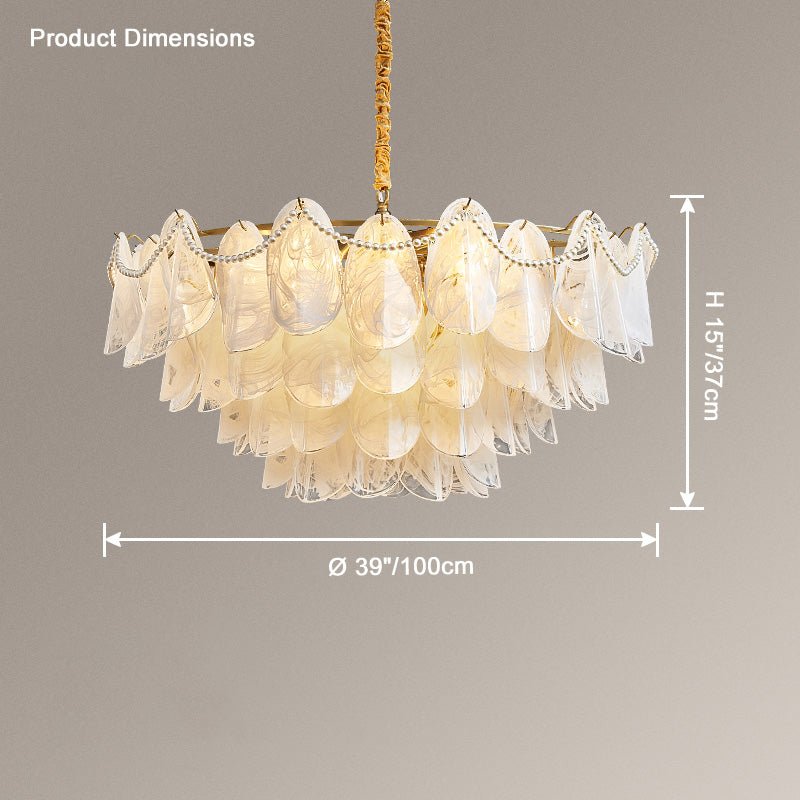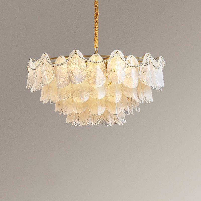 Elevate your living room with the exquisite jucci Tiered Glass Chandelier-WM2376. With a stunning gold finish and intricate textured glass, this chandelier adds a touch of luxury to any space. Adorned with a delicate string of pearls, it exudes elegance and complements Art Deco themes perfectly.