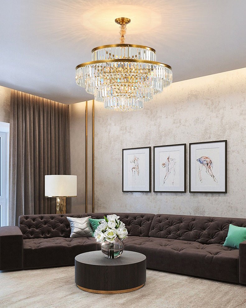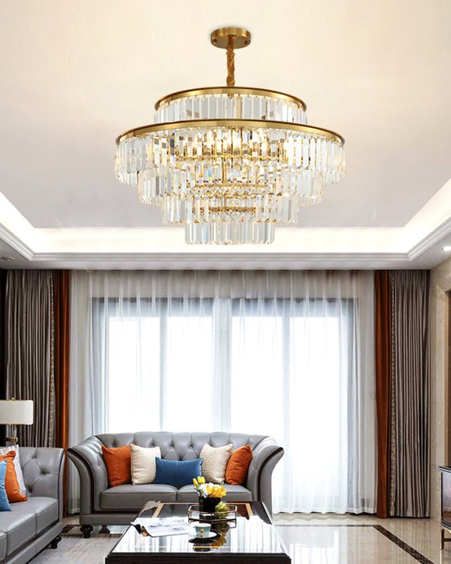 The jucci Tiered Gold Crystal Prism Chandelier adds a touch of elegance and art deco style to any living room. The sparkling crystal prisms catch the light and create a stunning display, while the gold finish adds a touch of luxury. Elevate your home with this beautiful chandelier!