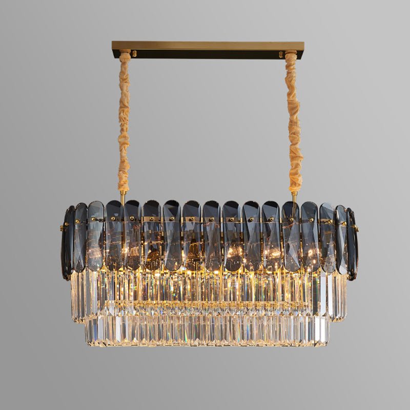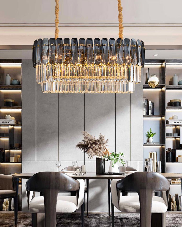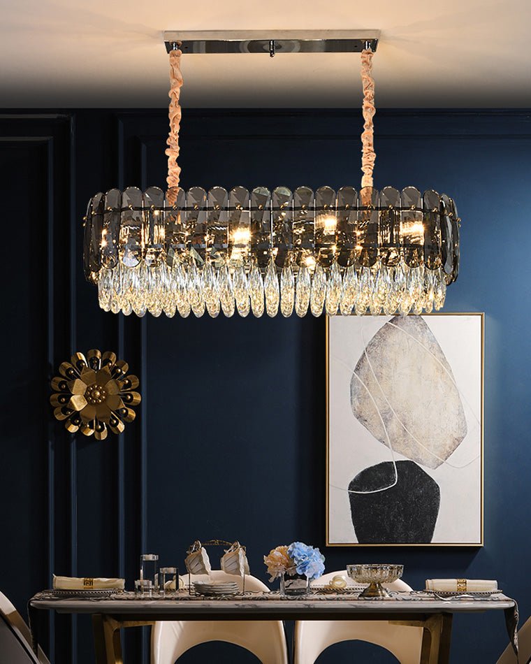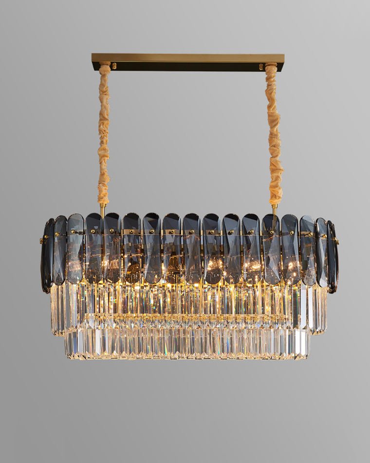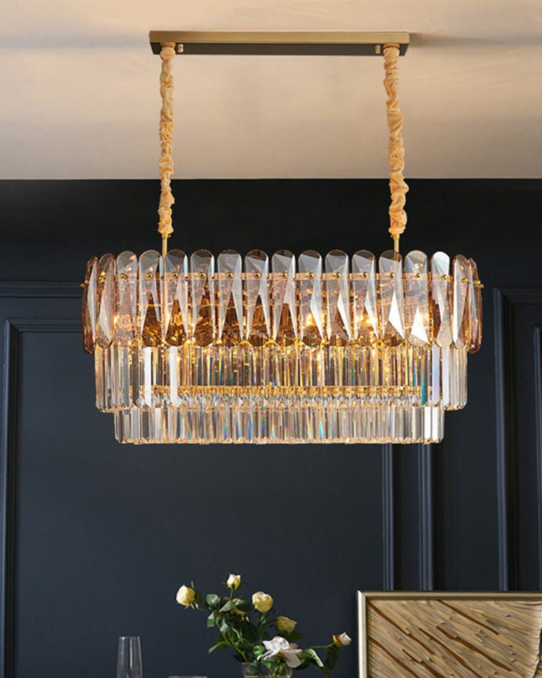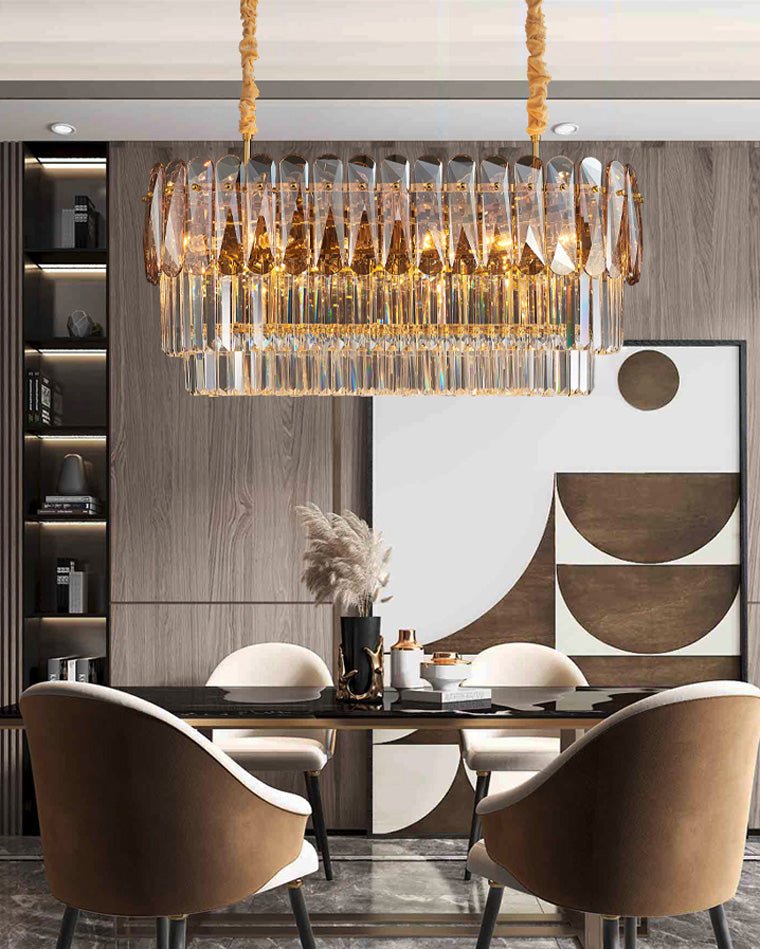 Elevate your dining room with our jucci Tiered Linear Crystal Chandelier! This Art Deco-inspired masterpiece features sparkling crystals in warm amber and smoked tones, adding a touch of luxury and glamour to any space. Bring elegance and sophistication to your home with this stunning statement piece.
