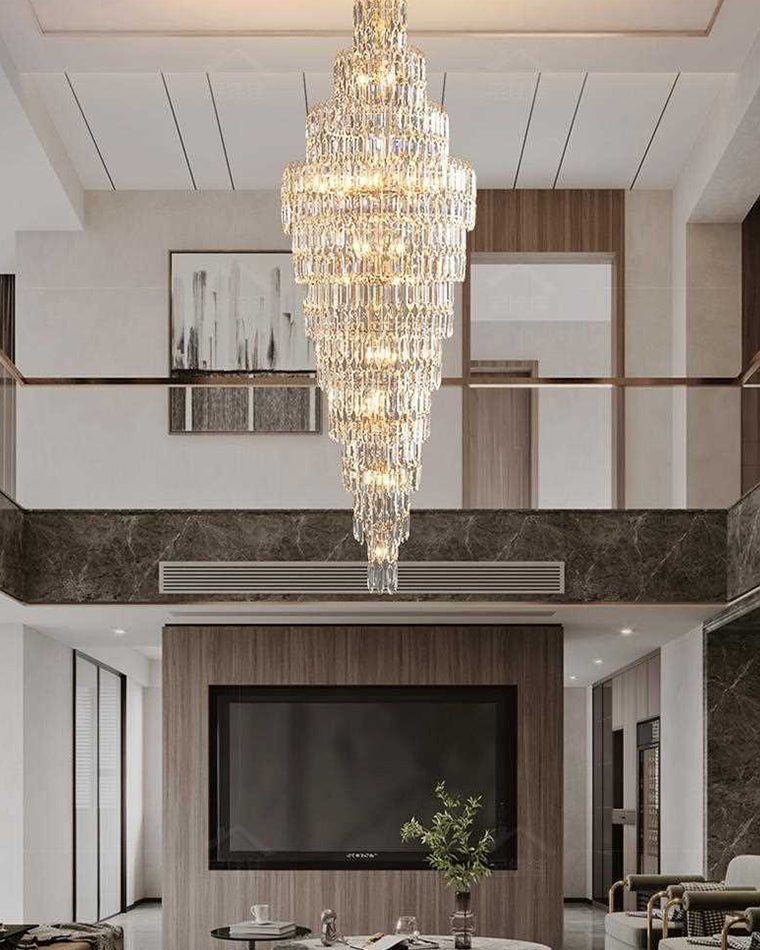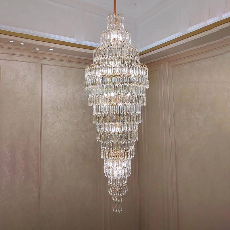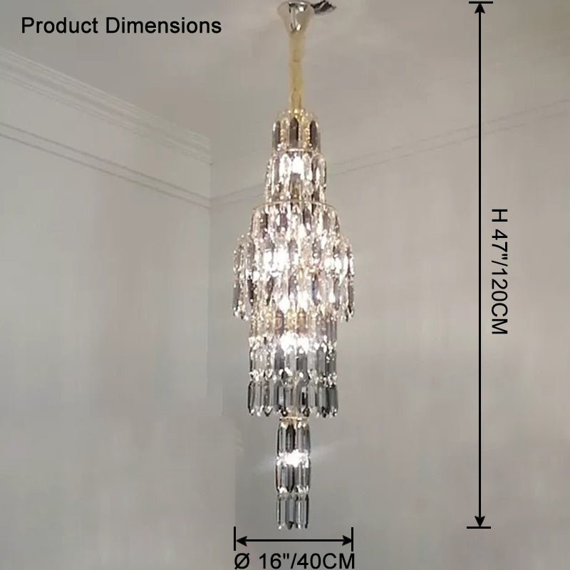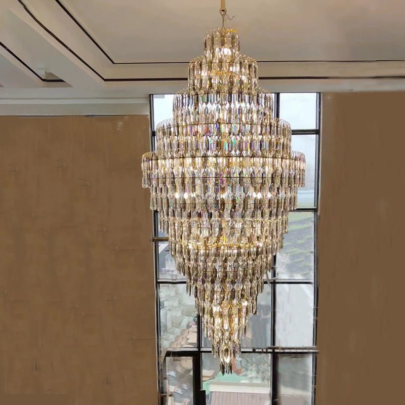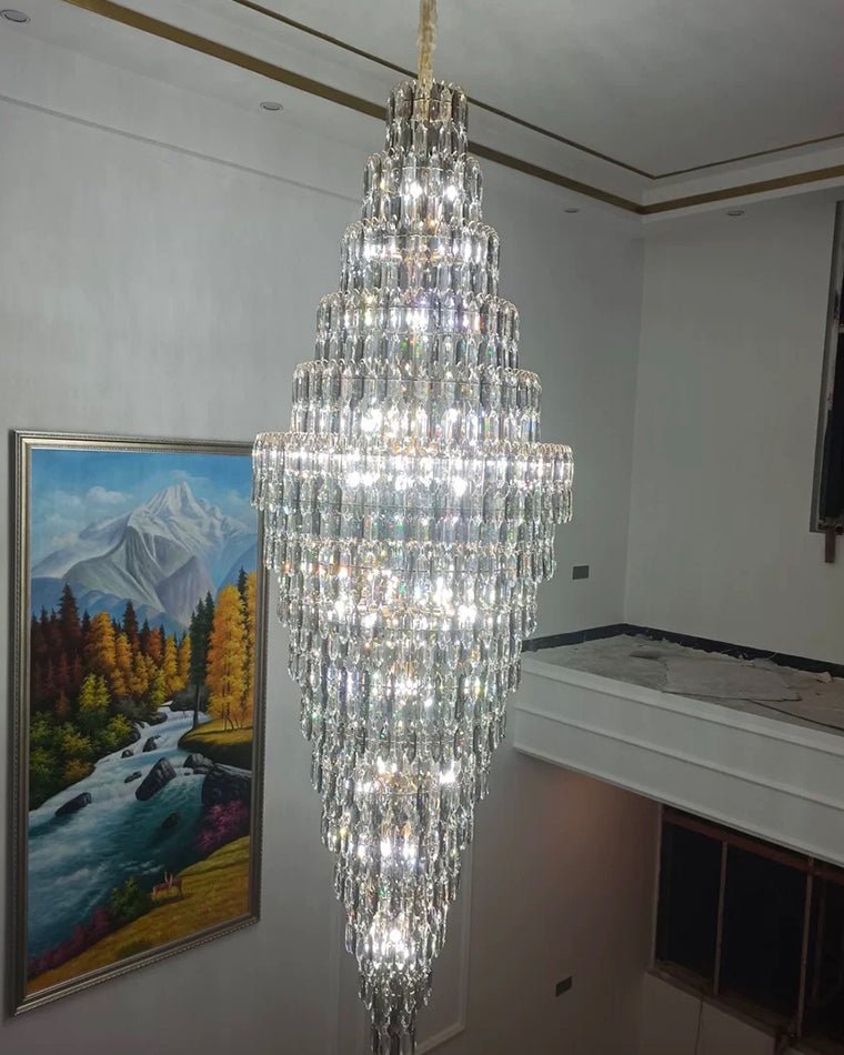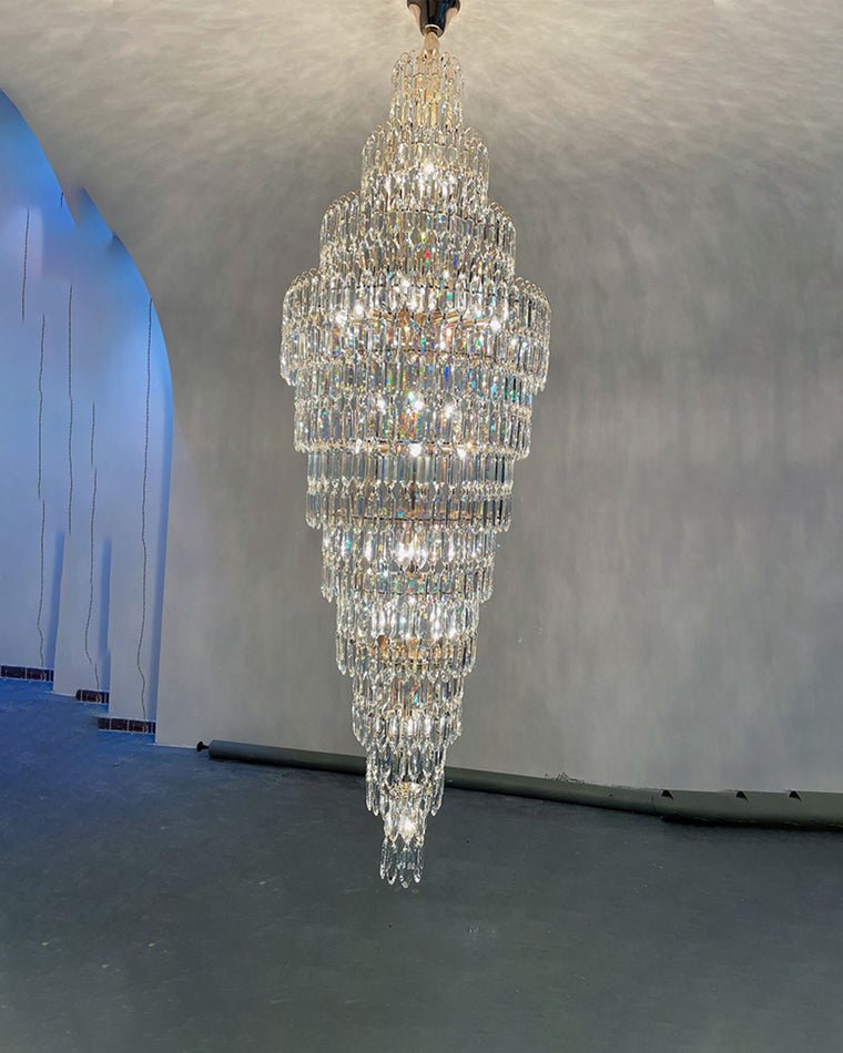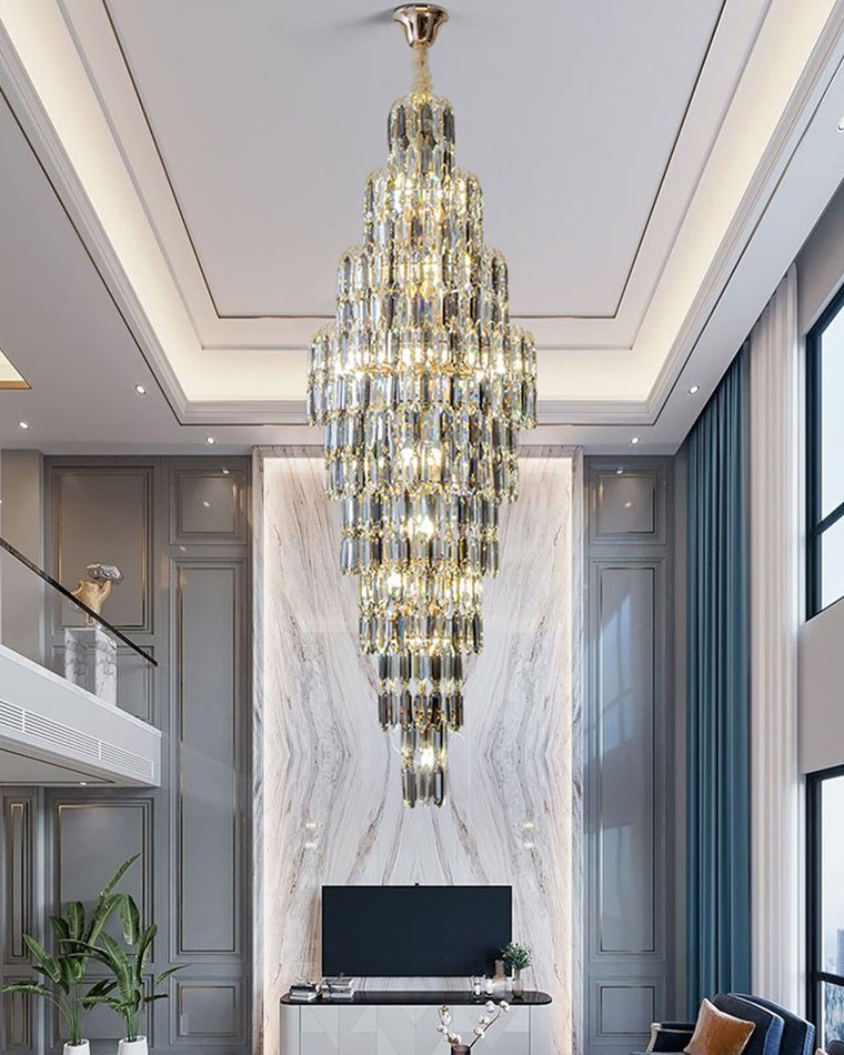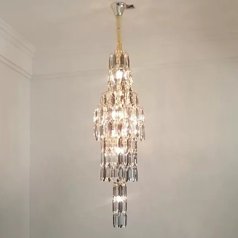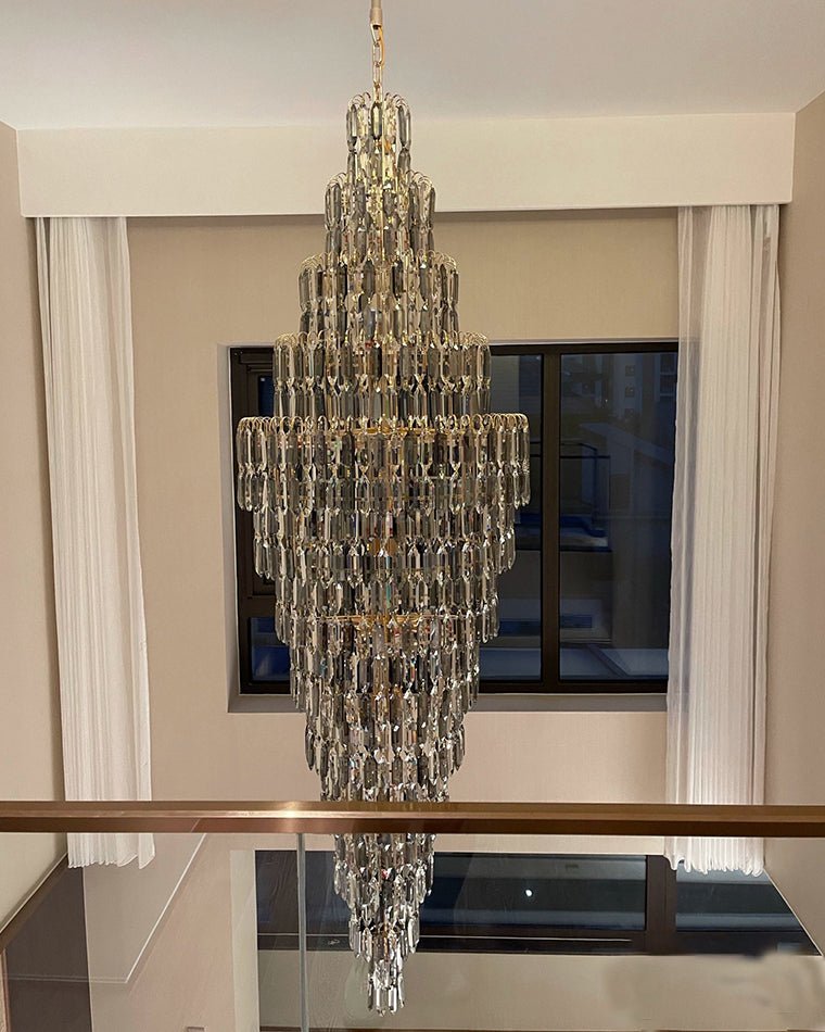 Elevate your space with the stunning jucci Tiered Tapers Crystal Chandelier. Its clear and smoked crystal design adds elegance to any staircase. Modern and contemporary, this chandelier is the perfect touch to any room. Experience the luxury and beauty of this exquisite piece.