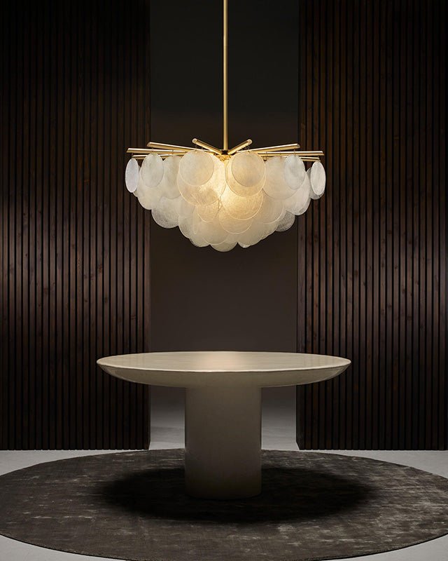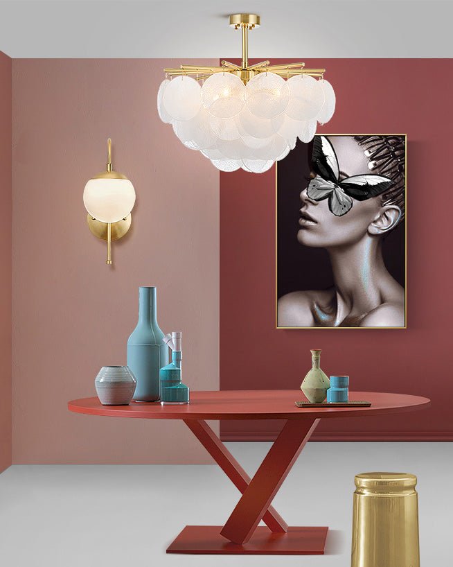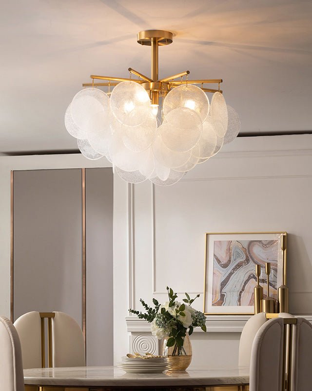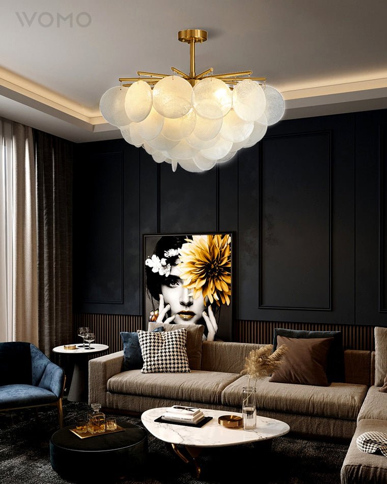 Each piece of glass of the Cloud Chandelier is hand-formed by our artisans using a process where undulations and crystal-like textures form. The translucent glass is complemented and beautifully framed by the symmetrical metalwork, with its chic and unique features, it surely be the focal point of any room as a modern art deco and adds elegance to any indoor space, from living rooms and bedrooms to restaurants and foyers.