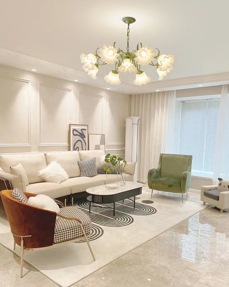 Elevate your living space with the vibrant and elegant jucci lily Glass Chandelier. The green finish adds a touch of nature, while the delicate glass flowers add a charming touch. Perfect for creating a cozy ambiance in your living room, bedroom, or dining room.