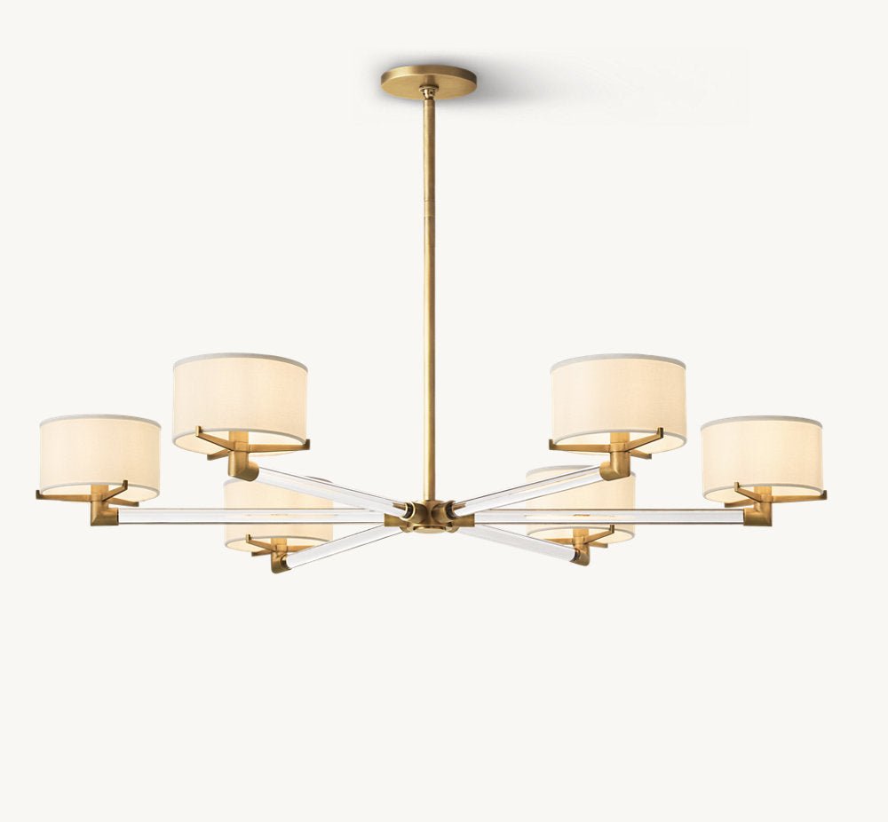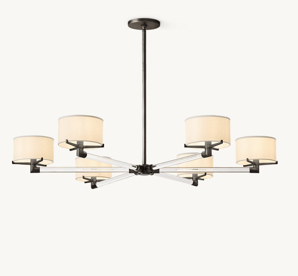 - Each arm is fitted with an Ivory linen closed-top drum shade