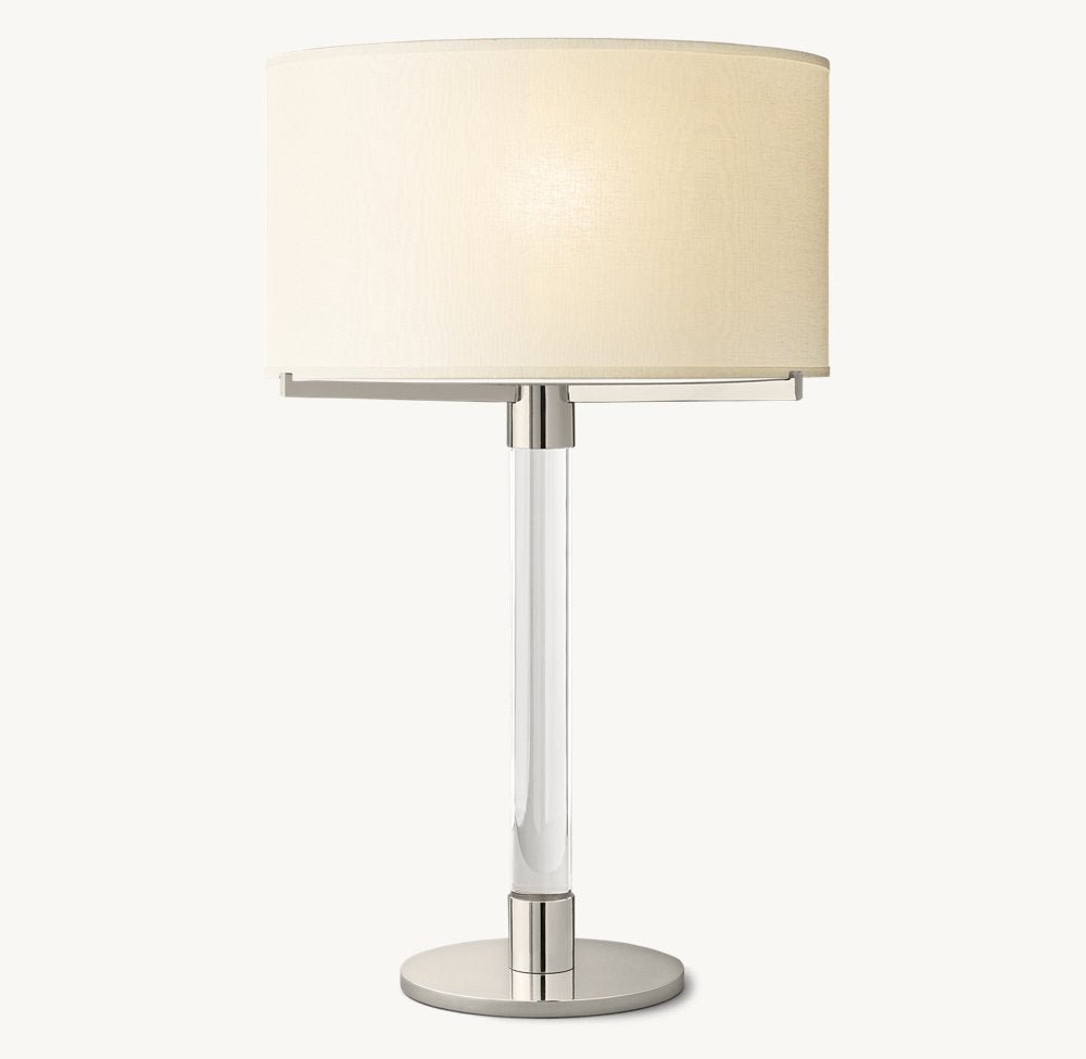 Designer Ian K. Fowler evokes the spare lines of 1960s minimalism in our Truman collection. Juxtaposing glass and metal, the design conveys a purity of line, shape, and material. A smooth crystal column rises up from the metal base, the electrical wiring invisible within its clear case. Circular forms are echoed throughout, yet the effect is long and linear.