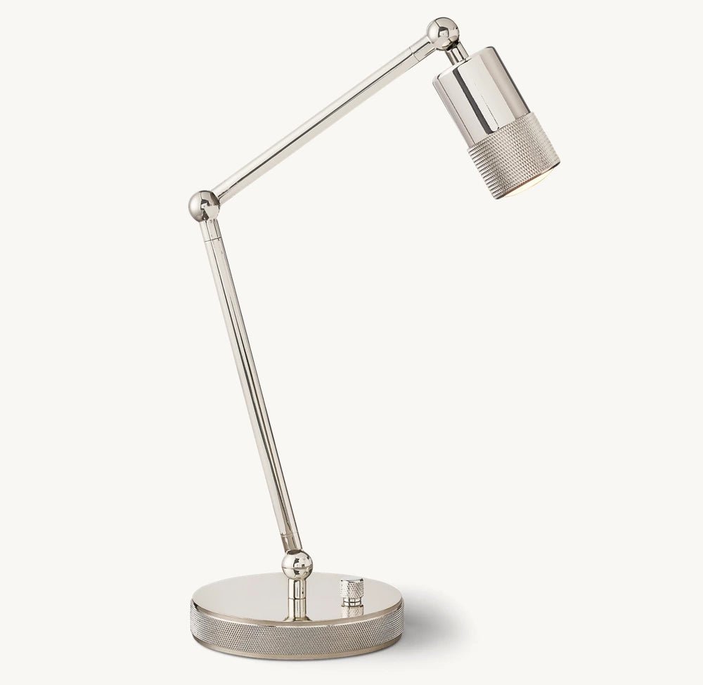 Our Utilitaire task lighting from Ian K. Fowler is both polished and spare, representing an industrial minimalist vision. A subtly integrated telescoping mechanism and rotating shade are thoughtfully designed to provide focused illumination. Precisely crafted diamond knurling on the shade and connectors offers restrained embellishment.