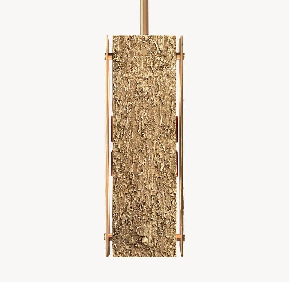 Solid brass is cast in a hand-formed mold to achieve the complex, sensuous texture that is the focal point of designer Jonathan Browning’s sculptural Vouvray collection. The minimalist geometric form is a perfect vehicle for the tactile surface, which evokes the work of modern master Alberto Giacometti. The glow is moody and atmospheric.