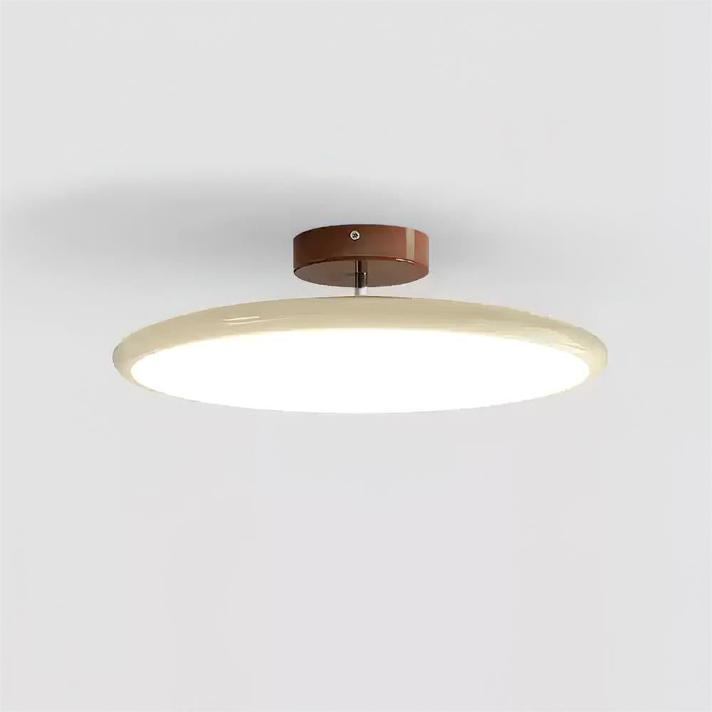 Available in two chic finishes, its sleek, flat disc shape adds an elegant touch to any room. The colored acrylic surface and minimalist wooden mount effortlessly combine to create a warm, even glow that elevates your living space.